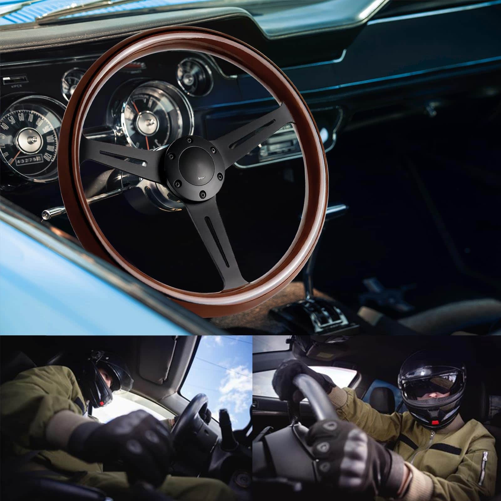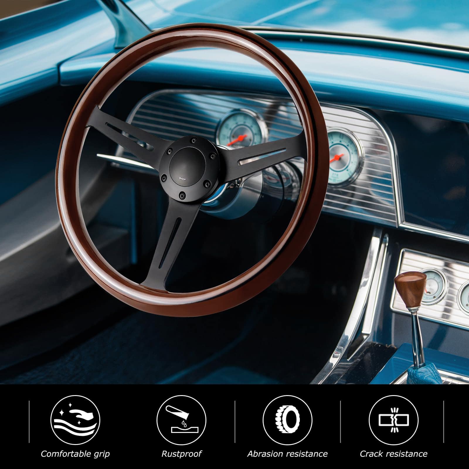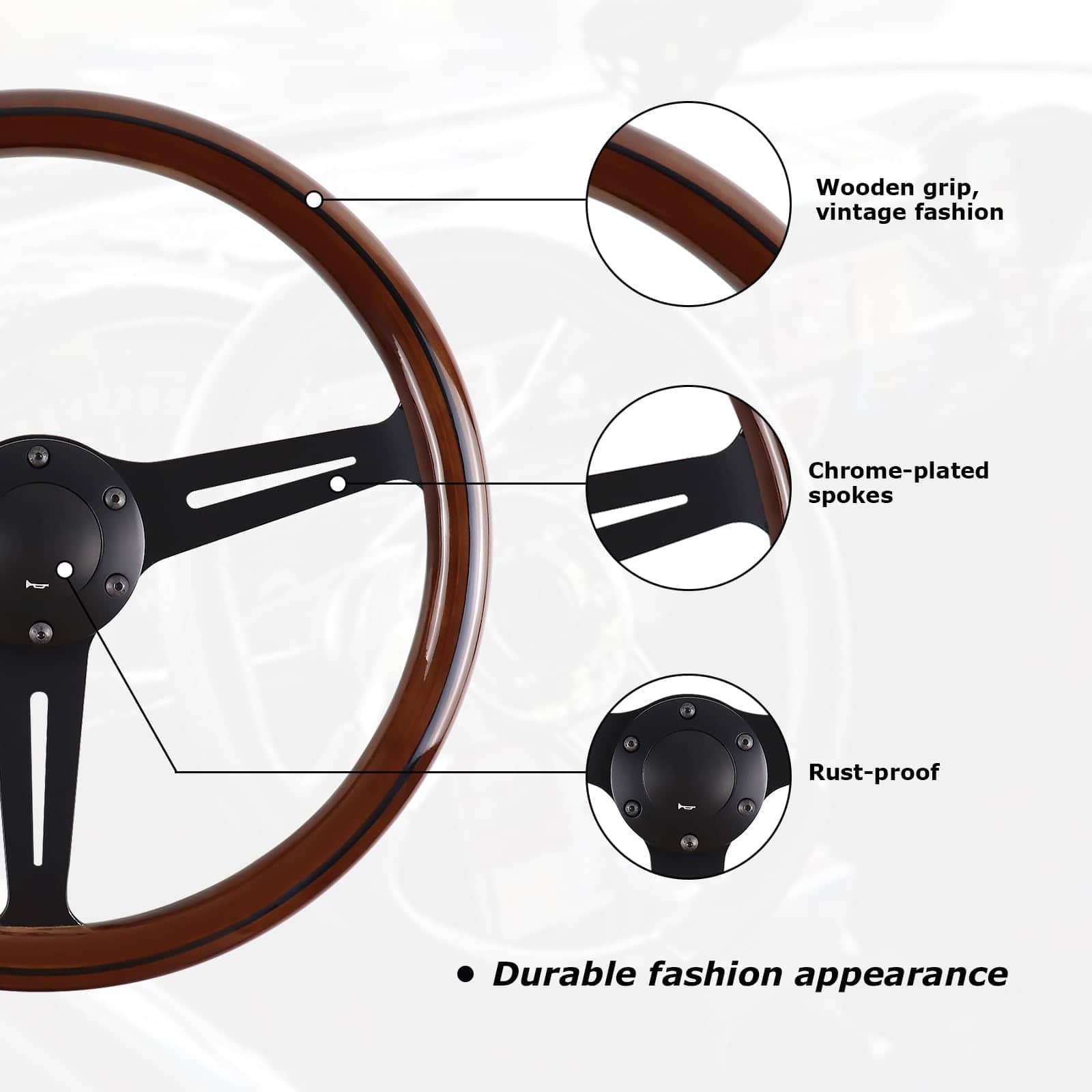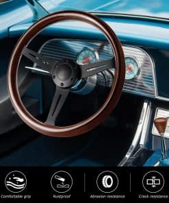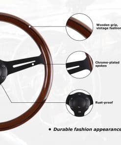 1. Material de primera calidad: Los radios de acero inoxidable de este volante de madera están cromados y tienen una superficie suave tipo espejo. El material es resistente, ligero, resistente al calor, a la corrosión y duradero.