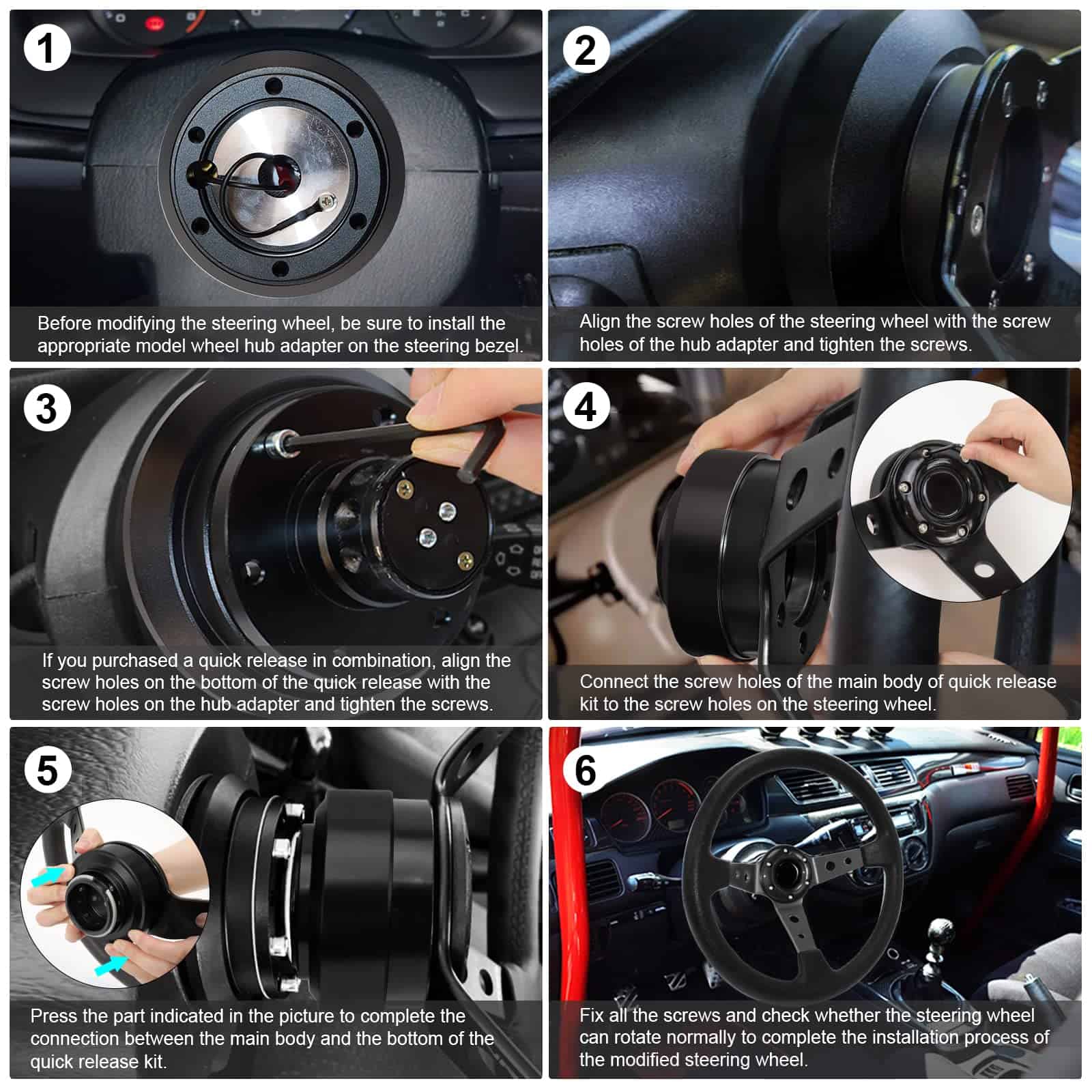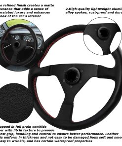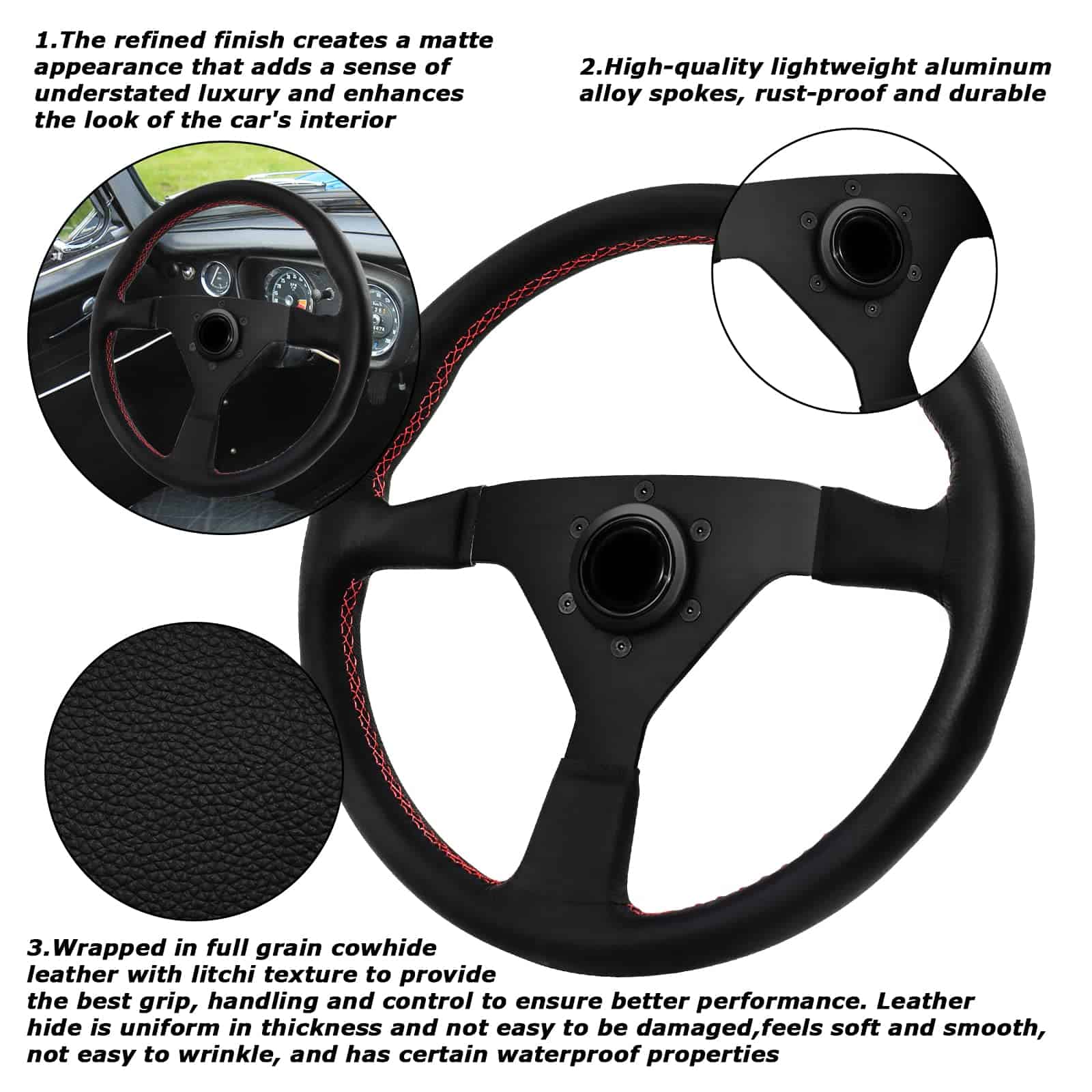Radios de aleación de aluminio de alta calidad y livianos, envueltos en cuero de vaca de grano completo con textura de lichi, adaptables a la mayoría de los adaptadores de cubo estándar para automóviles. Se adaptan a la palma para mejorar la experiencia de conducción. Diseño elegante y acabado mate que añade un toque de lujo al interior del coche. Amplia variedad de opciones de diseño y adaptadores de volante disponibles. Fácil de instalar siguiendo videos de instrucciones específicas en YouTube. Excelente servicio al cliente con la posibilidad de devolución o cambio en caso de paquete incompleto.