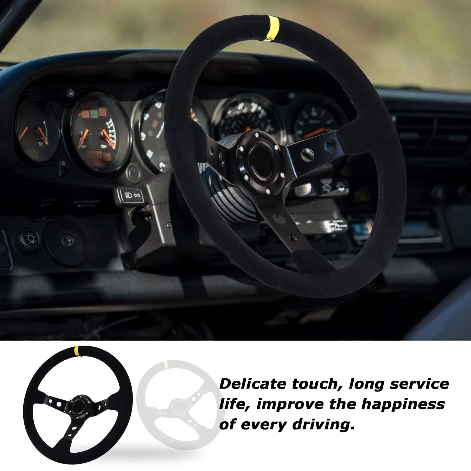 2. Excelente sensación al tacto: La superficie del volante está envuelta con gamuza, lo que es muy delicado al tacto. Incluso si sus manos sudan, el efecto antideslizante sigue siendo muy bueno, lo que le ayuda a ajustar con precisión la dirección del volante.
