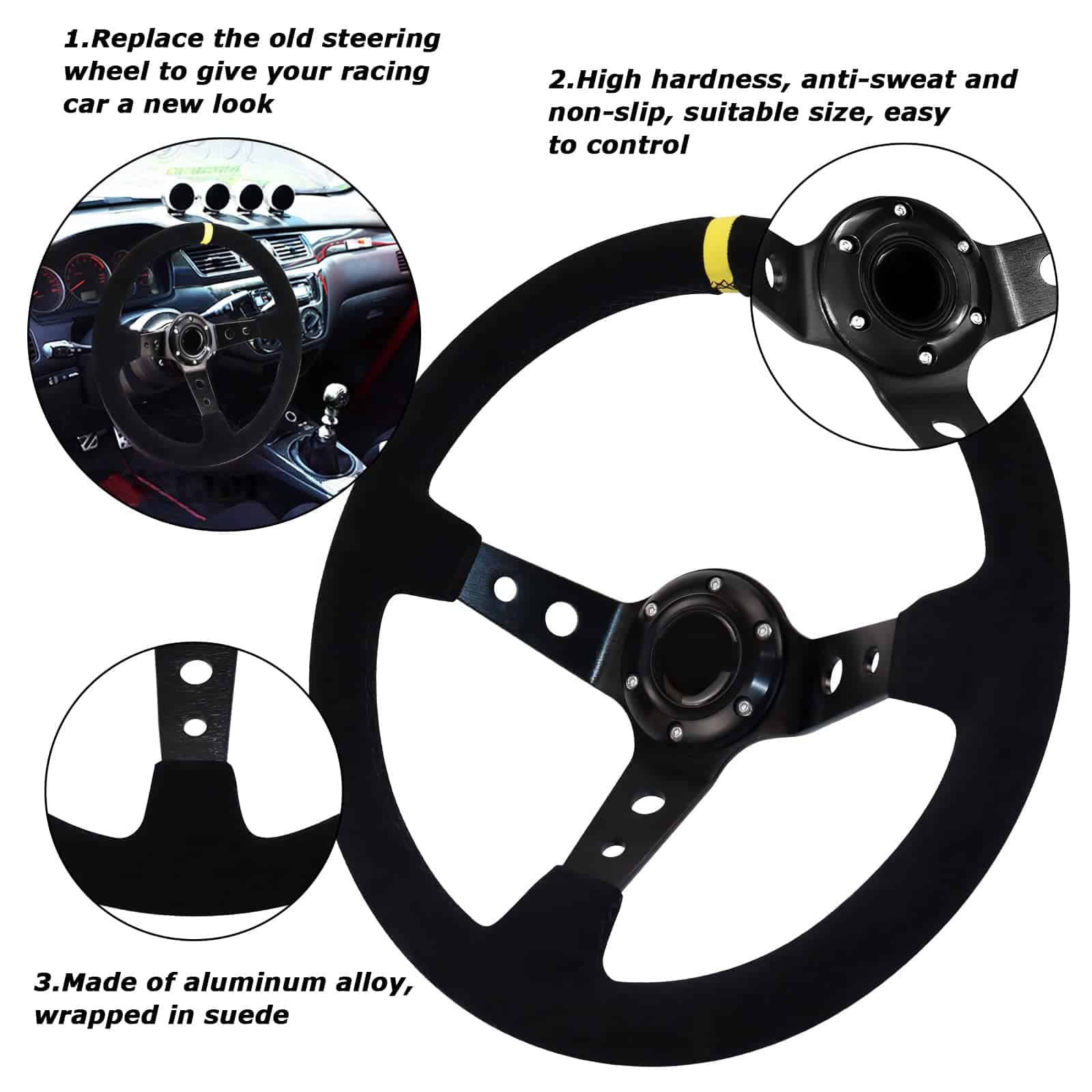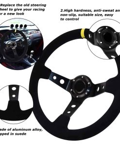 1. MATERIAL: El volante de carreras está hecho de aleación de aluminio, que tiene las características de alta dureza, peso ligero, resistencia a altas temperaturas y resistencia a la corrosión. El volante está envuelto en gamuza, lo que puede lograr efectivamente antideslizante y absorción de impactos, mejorar la maniobrabilidad al conducir y sostenerlo con ambas manos para brindar una experiencia de carreras emocionante al instante. El diseño meticuloso mejora su comodidad y felicidad cada vez que conduce.