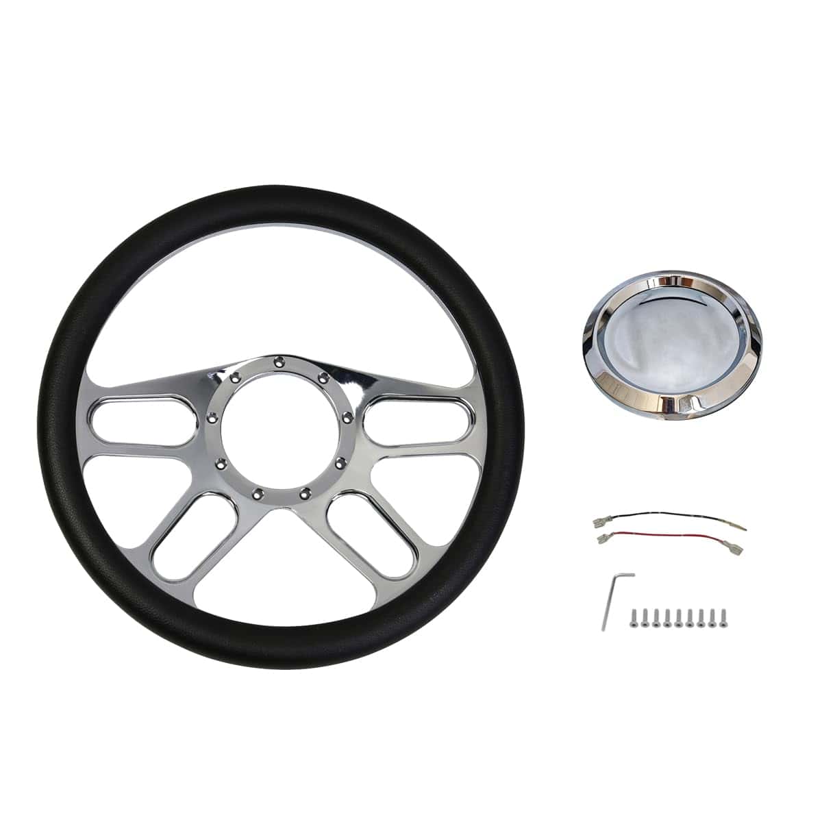 Se ajusta a la mayoría de las columnas de dirección estilo GM de 1967-94, compatible con el adaptador de 9 pernos de GM. ¡VOLANTE DE DIRECCIÓN Y BOTÓN DE CLAXON Y HARDWARE DE MONTAJE ÚNICAMENTE. NO INCLUYE ADAPTADOR!