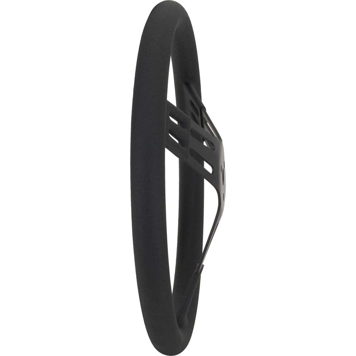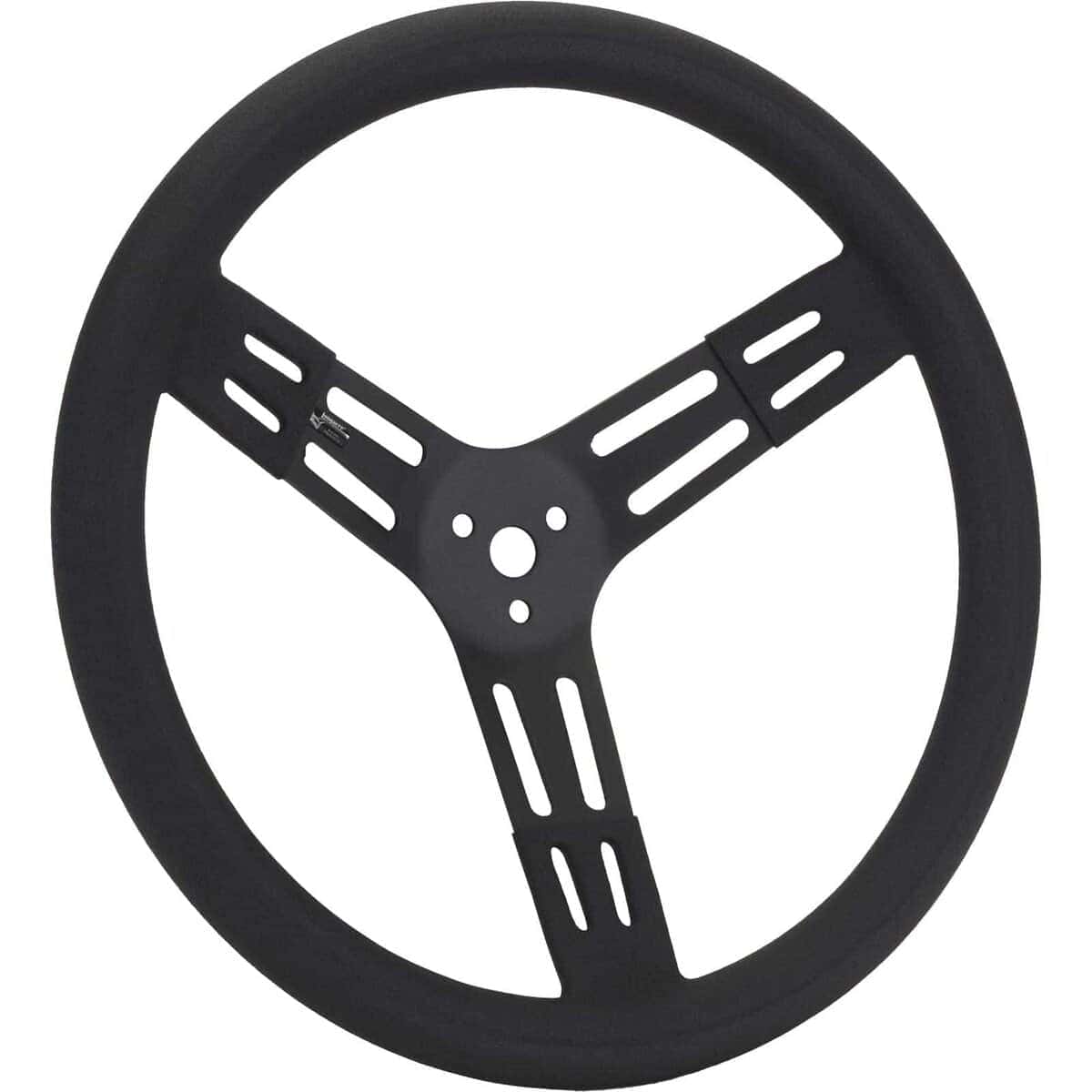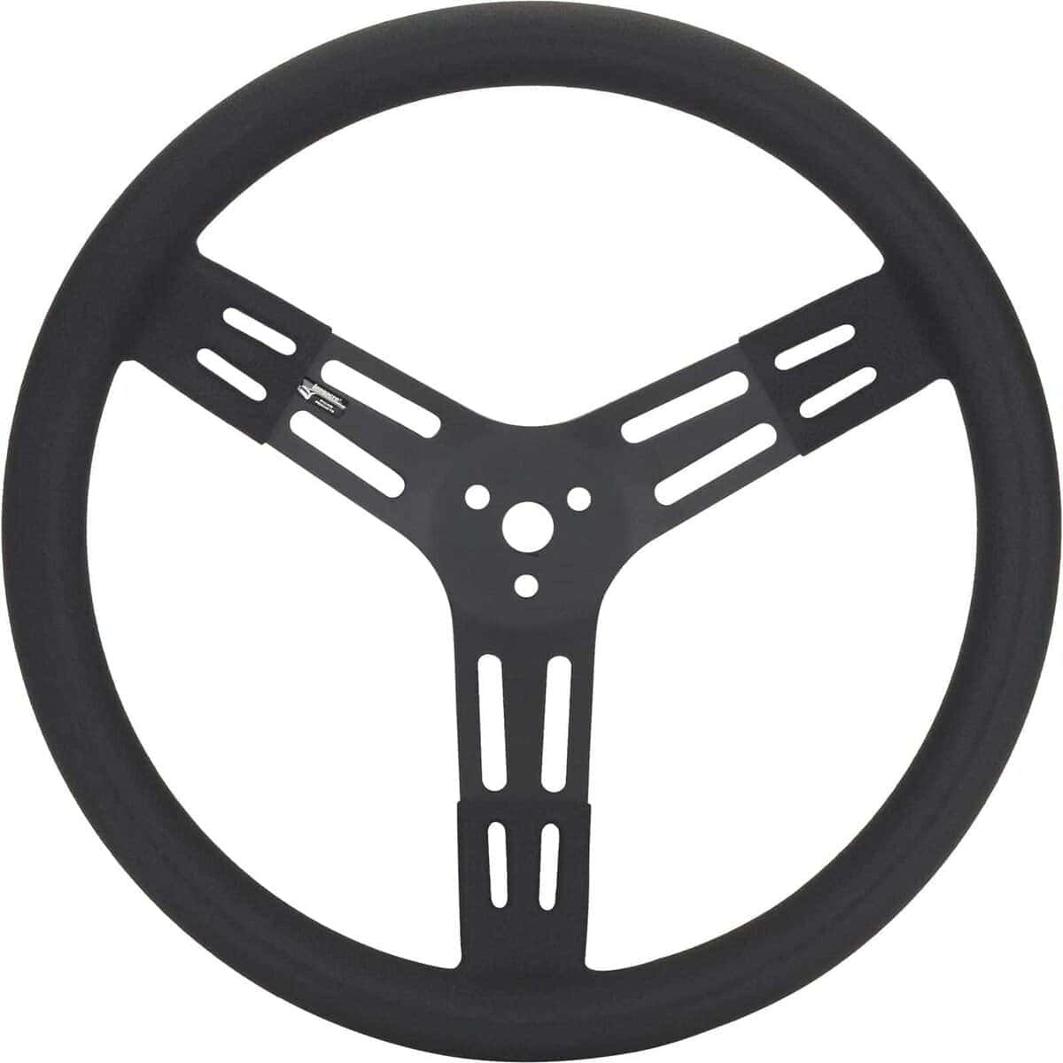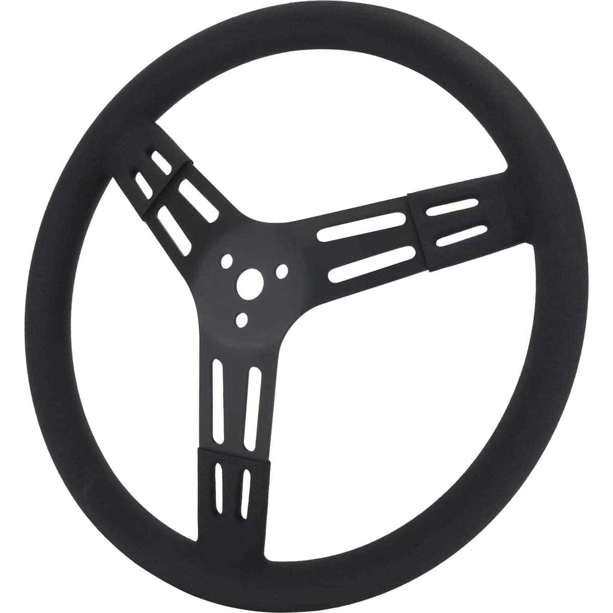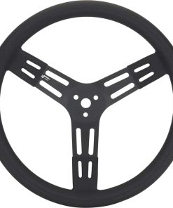 Volante de dirección de acero negro de 15″ con agarre suave. Tiene un plato de 2 -3/4″ de profundidad y 3 agujeros de montaje de 5/16″ en un círculo de perno de 1-3/4″ (distancia entre agujeros 1-1/2″ centro a centro). El volante presenta un diseño clásico de 3 radios y está construido en acero con un acabado anodizado negro para una mayor resistencia a la corrosión. El agarre suave está hecho de un material duradero de neopreno. Se necesita un cubo de desconexión rápida: tanto el cubo Longacre Precision Fit Splined QD Pro con liberación de anillo como el Cubo Hex QD con liberación de botón pulsador funcionarán con este volante de dirección.