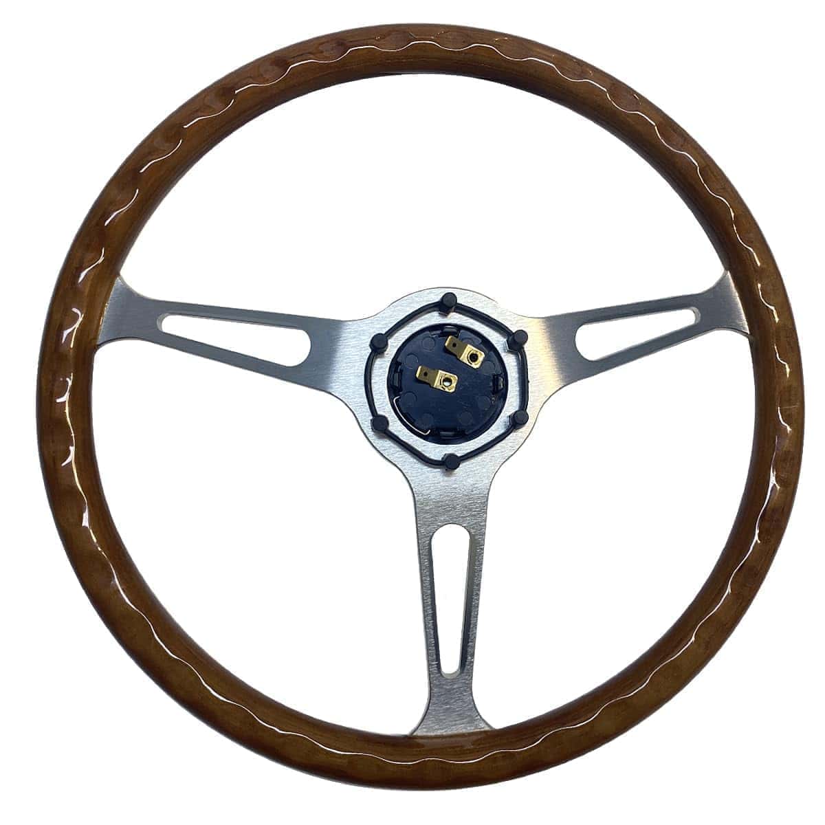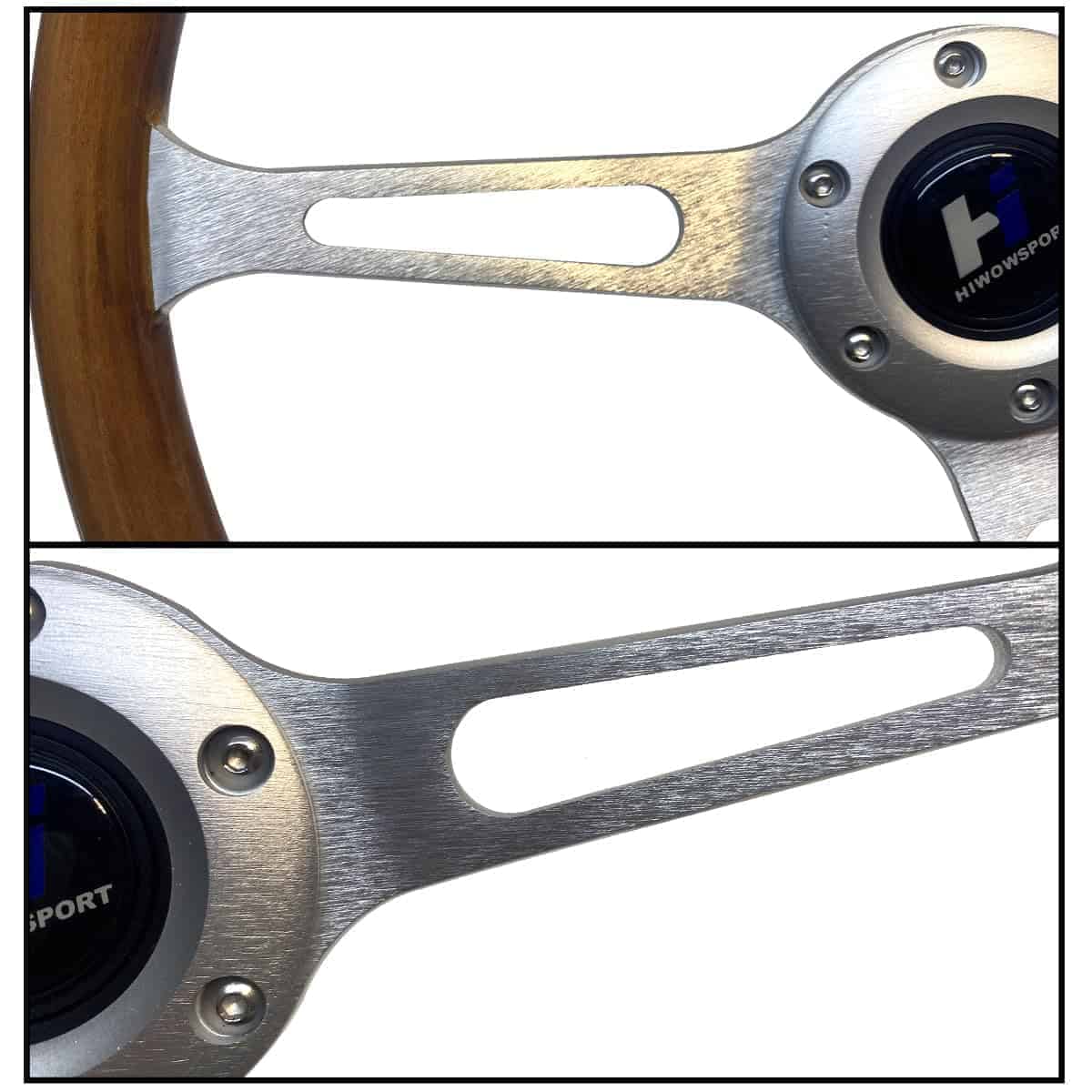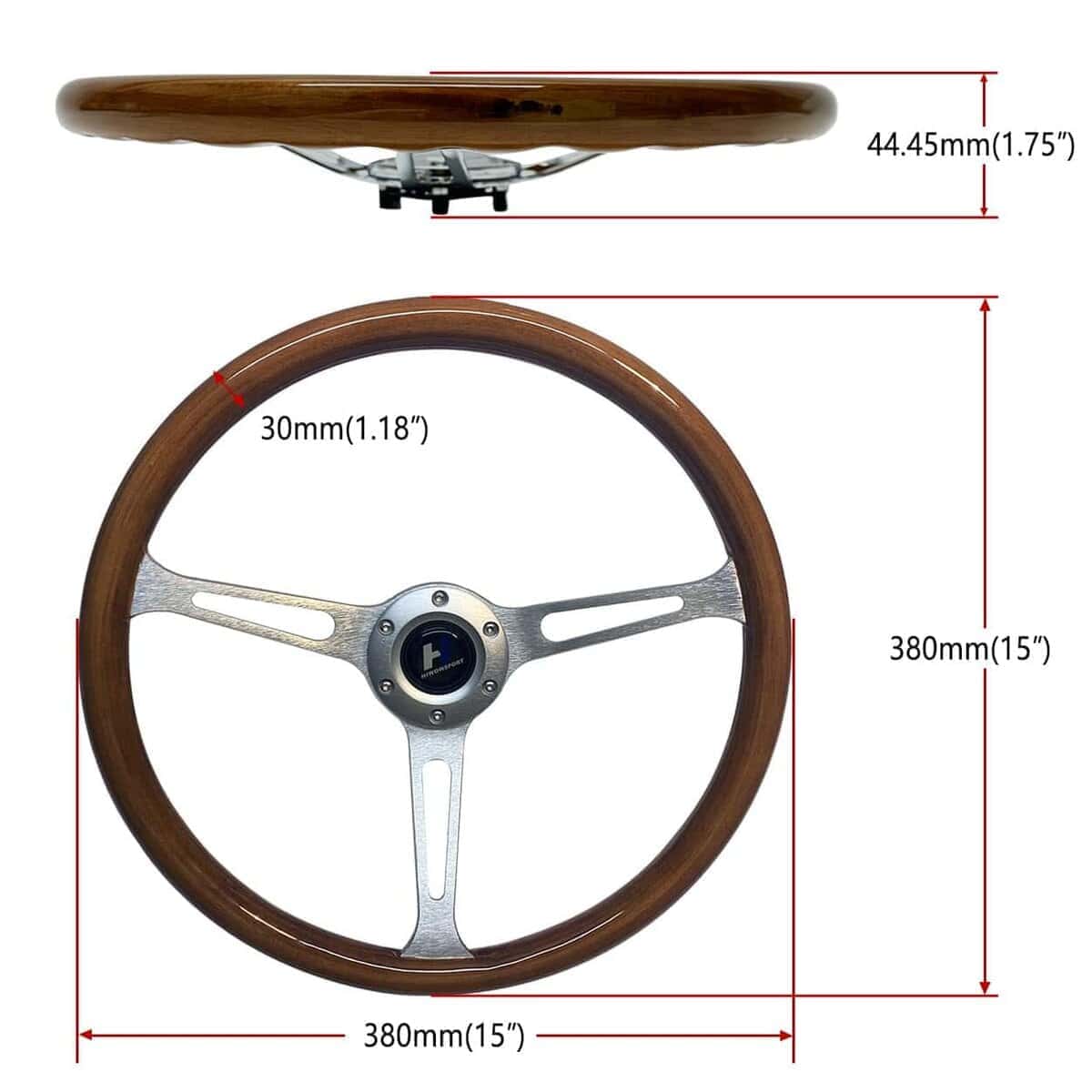 Volante de madera de 15 pulgadas con grano de madera, profundidad de 1.5 pulgadas, plateado cepillado, 3 radios clásico de madera, volante de 380 mm con botón de bocina, 6 pernos