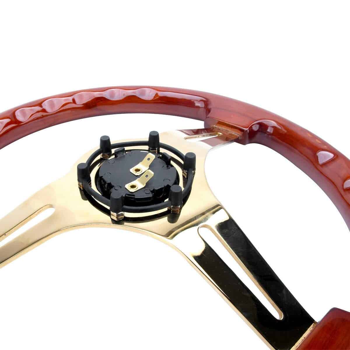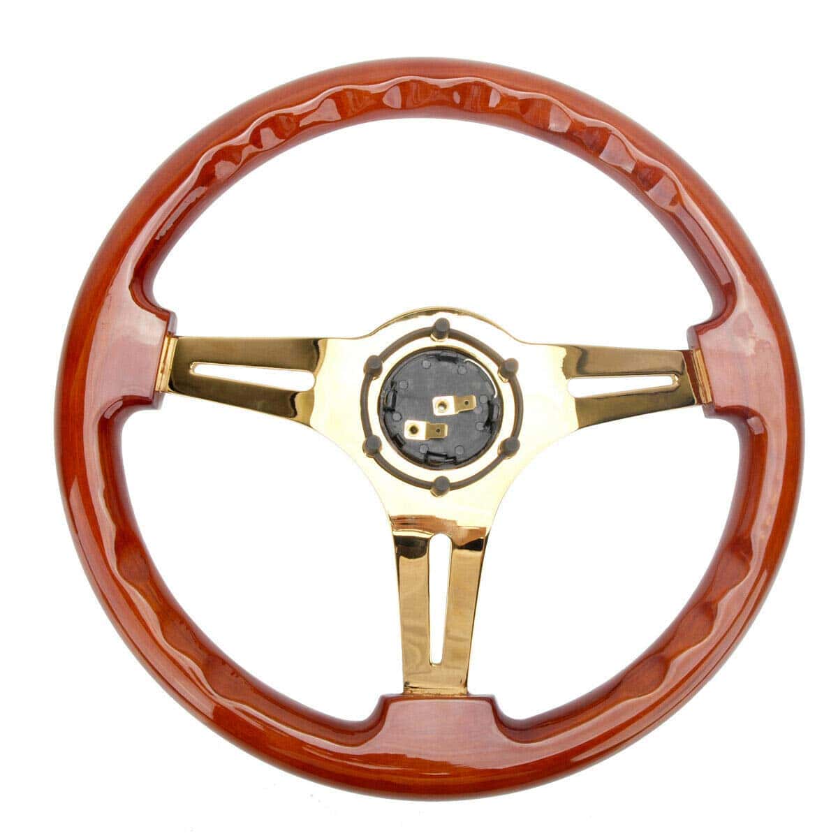 Volante de 14″ con textura de madera y 6 pernos con 1.5″ de profundidad color oro cromado para Acura Color: Color de madera Diámetro: aproximadamente 14″ (350mm) Grosor del agarre: 1″ (25mm) Profundidad: 1.5″ (38mm) Número de agujeros: 6 Material principal: madera Material de los rayos: hierro Acabado de los rayos: rayos cromados en oro Este artículo es 100% NUEVO Garantía: 1 año
