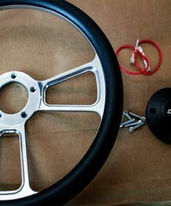Volante Muscular Billet de 14″ con Envoltura de Vinilo Negro para Chevy Car/Truck 69-94 Incluye: Volante SÍ Botón de Bocina SÍ Adaptador de Instalación SÍ DESCRIPCIÓN: – El volante presenta un agarre frontal de vinilo granulado negro y un agarre trasero de aluminio con ranuras para los dedos. Adaptador de Cubo A01 Compatible con: COLUMNAS DE DIRECCIÓN DEL MERCADO DE ACCESORIOS: Flaming River/ Ididit que utilizan estrías de GM/Chevy de modelos recientes: Todos los Años AUTOMÓVILES AMERICAN MOTORS: Todos los Modelos (excl. Alliance/Encore) (1970-88): 1970-88 BUICK: Todos los Modelos con columna no telescópica: 1969-93 CADILLAC: Todos los Modelos con columna no telescópica: 1969-89 Compatible con COCHES CHEVROLET (excluyendo Corvette): Todos los Modelos (excluyendo. Corvette, Sprint, Spectrum, 86-88 Nova): 1969-94 Compatible con CHEVROLET/GMC (Camionetas y Vans): Modelos de Camioneta: 1974-94 Compatible con CHEVROLET/GMC (Camionetas y Vans): El Camino, Sprint, Caballero: 1968-88 Compatible con CHEVROLET/GMC (Camionetas y Vans): Chevy/GMC Van: 1982-94 CHRYSLER CORP – AUTOMÓVILES DOMÉSTICOS (Dodge, Chrysler, Plymouth): Columna Inclinable: 1978-81 CHRYSLER CORP – CAMIONETAS Y VANS DOMÉSTICAS (Dodge, Chrysler, Plymouth): Pick-up 2/4WD, Trailduster, Ramcharger, Van: 1979-81 JEEP: CJ5, CJ6, CJ7, Wrangler, Cherokee, Wagoneer, Pick-up, Scrambler, Comanche: 1976-95 JEEP: Cherokee, Wagoneer, Pick-up: 1974-75 OLDSMOBILE: Todos los Modelos (excluyendo columna telescópica): 1969-93 PONTIAC: Todos (excluyendo LeMans de 88 en adelante): 1969-93