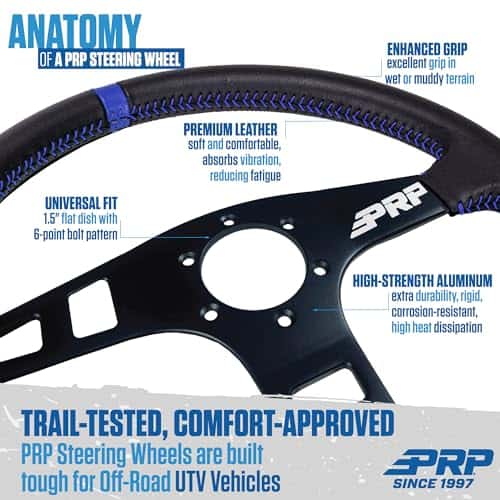 Los Volantes de PRP están construidos para Off-Road. Construidos en aluminio de alta resistencia, con un acabado negro mate para una durabilidad extra y para que se vea genial. El volante tiene un patrón de pernos de 6 puntos, específicamente elegido porque se adapta a la mayoría de los lanzamientos rápidos de posventa. Viene con una placa de emblema de PRP. Disponible en cuatro colores diferentes.
