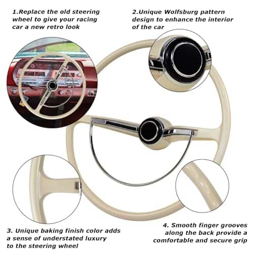 Este volante retro es compatible para: Beetle / Bug Tipo 1 1962-1971, Type 3 Squareback, Fastback, Notchback 1962-1971, Karmann Ghia 1962-1971. (Los modelos mencionados anteriormente se pueden instalar directamente sin la base/adaptador, otros modelos necesitan instalar una base/adaptador adecuado si desea instalar este volante).