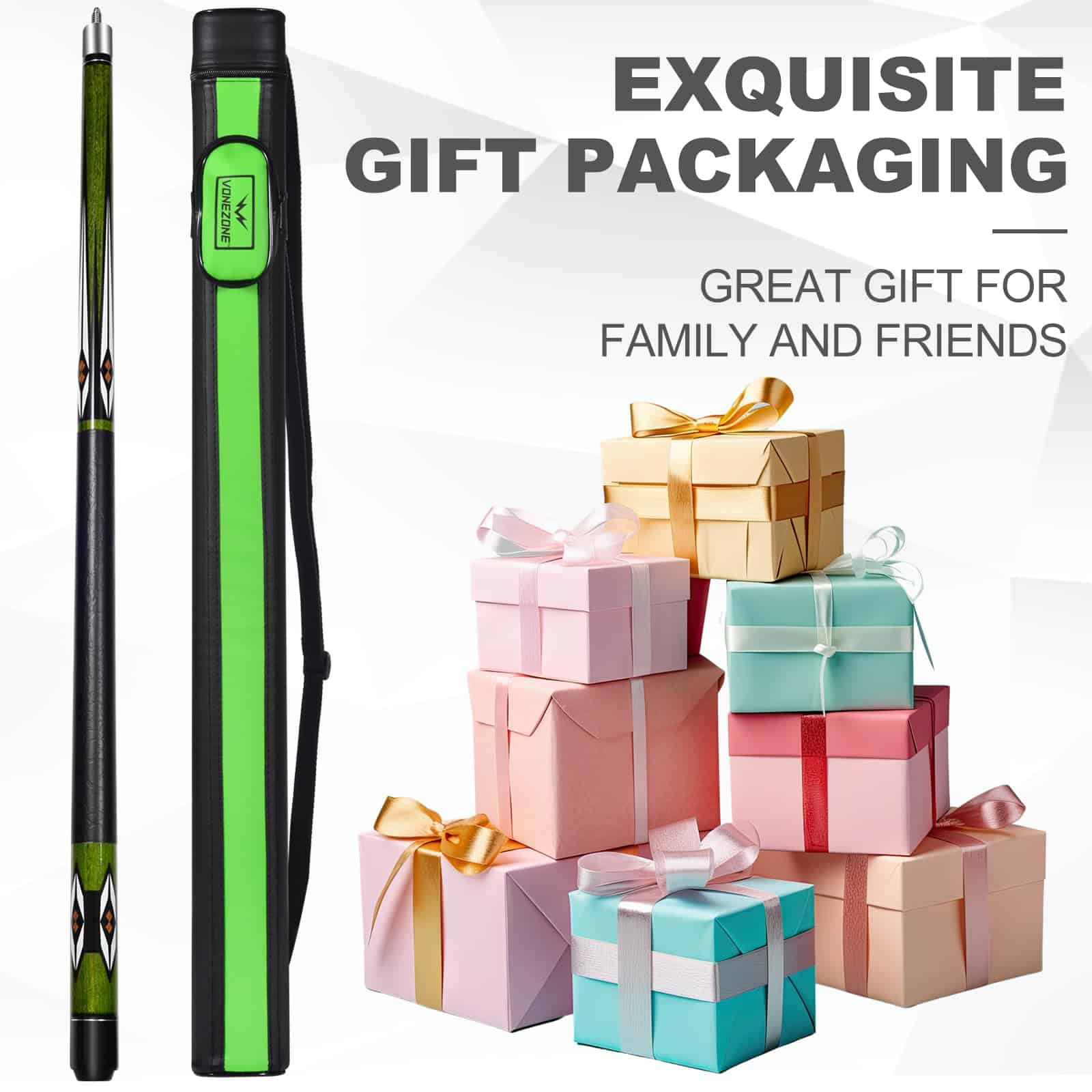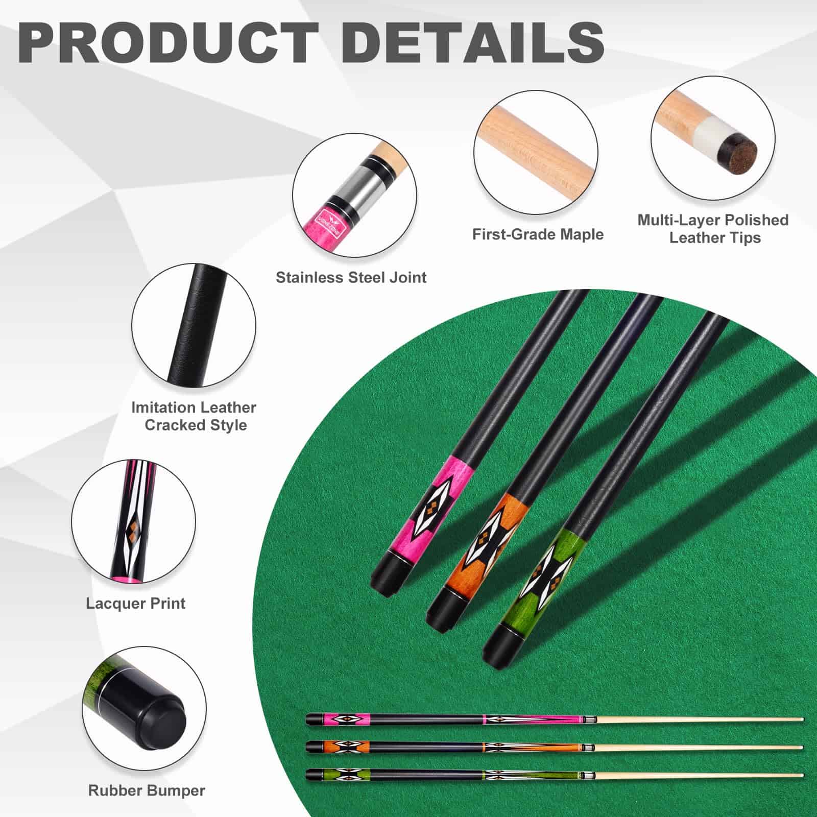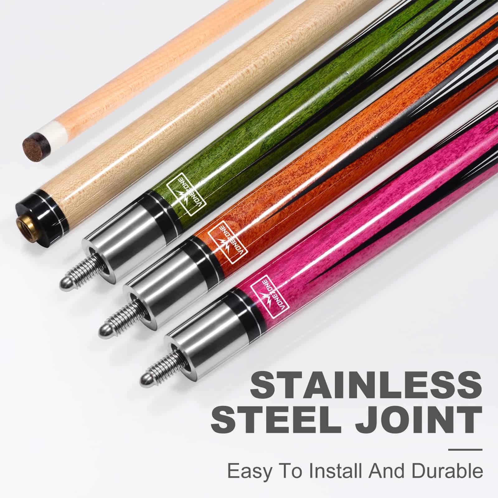 VONEZONE Taco de Billar, un taco de billar de alta calidad profesional diseñado para jugadores serios que buscan mejorar su juego. Este taco de billar de 58 pulgadas y 19-21 onzas está hecho de madera de arce de primera calidad con punta de cuero para una mayor durabilidad y rendimiento. Las juntas de acero inoxidable empotradas minimizan las brechas, proporcionan buena resistencia a la corrosión y tecnología antivibración, mientras que son fáciles de almacenar y transportar. Cada taco de billar se inspecciona rigurosamente para garantizar un eje recto y libre de flexión, con un diseño agrietado con apariencia de cuero que proporciona fricción moderada y evita el deslizamiento, asegurando la estabilidad de cada golpe y reduciendo el riesgo de desviación. El color verde del taco de billar es un verde manzana llamativo y saturado que irradia vitalidad y estilo, haciéndolo distintivamente atractivo en la mesa y el punto de atención de los palos de billar para hombres. Los tacos de billar VONEZONE están protegidos por múltiples procesos de barnizado para prevenir la humedad y la deformación, manteniendo la integridad del taco de billar y haciéndolo más duradero y confiable que los diseños tradicionales envueltos. El set de Taco de Billar VONEZONE incluye un taco de billar de 58 pulgadas y 19-21 onzas, un estuche rígido para taco, un par de guantes y dos tizas, todo lo que necesitas para tus partidas, para que puedas disfrutar del juego en cualquier momento y lugar.