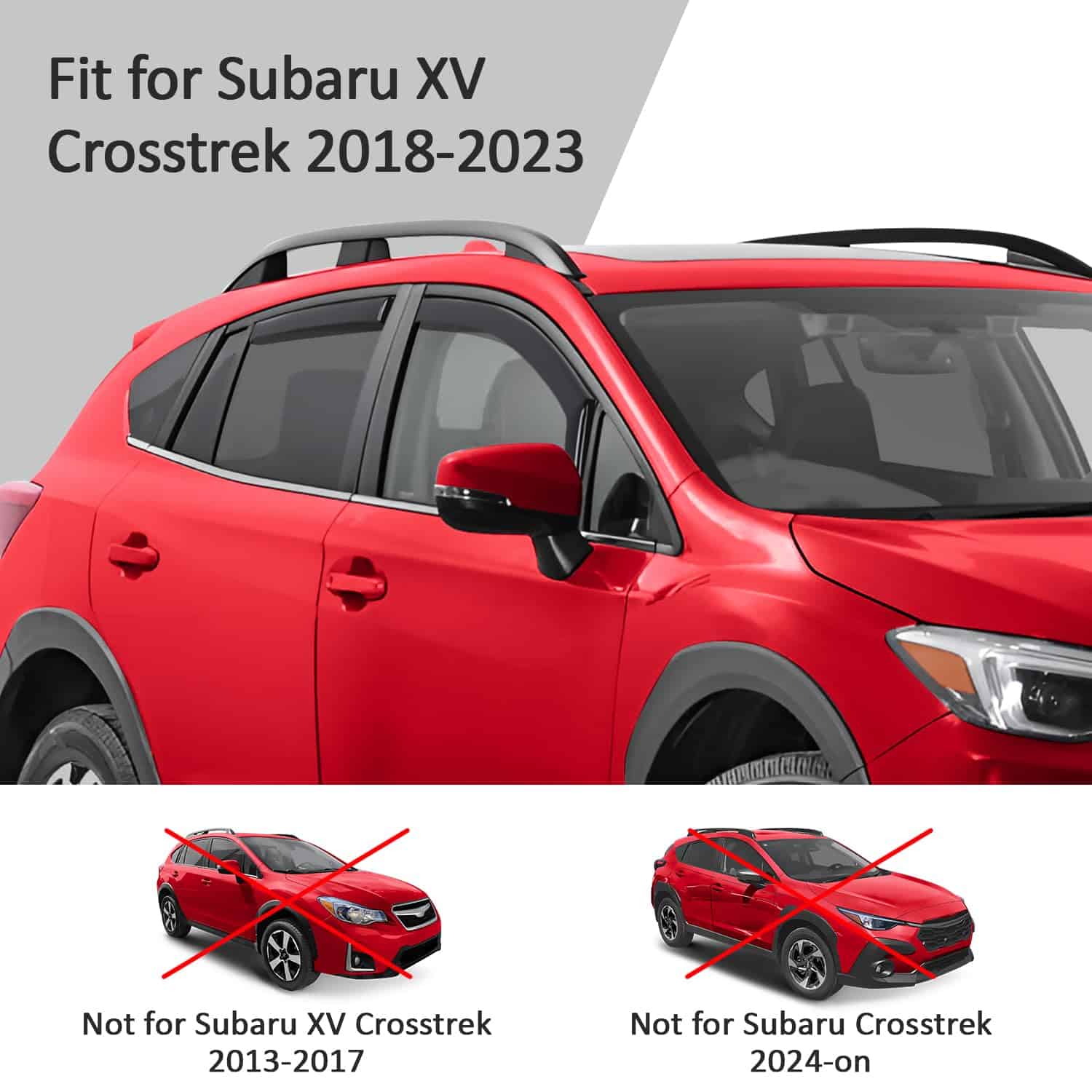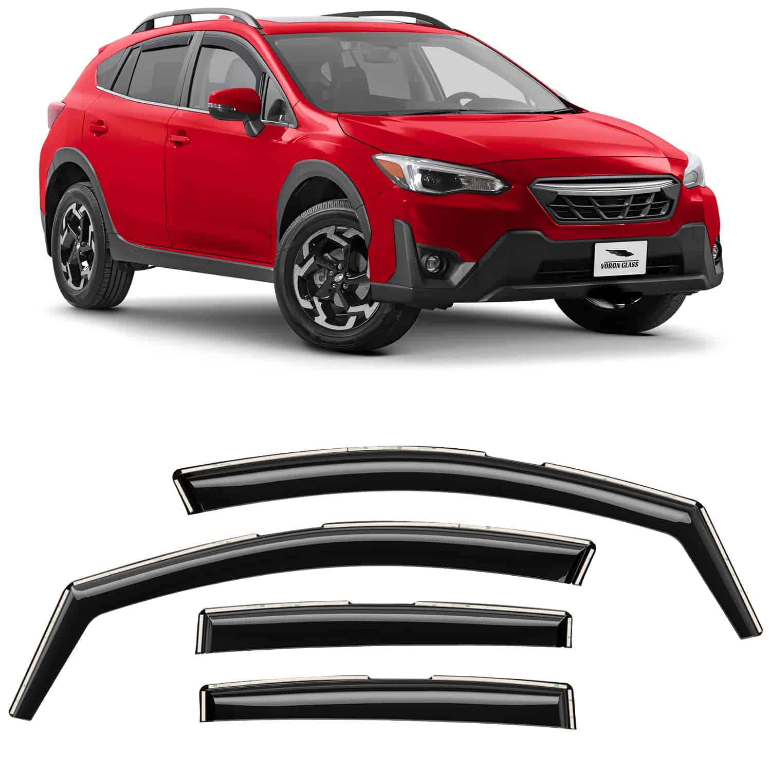 Voron Glass Deflectores de Lluvia Extra Duraderos en el Canal de Ventana para Subaru XV Crosstrek 2018-2023/Subaru Impreza 2017-2023 Hatchback, Viseras de Ventana de Ventilación, 4 Piezas – 200477. ¡Atención! ¡AJUSTE PERSONALIZADO solo para Subaru XV Crosstrek 2018-2023, Subaru Impreza 2017-2023 Hatchback. Policarbonato Extra Duradero Los deflectores de aire para ventanas de coche Voron Glass están hechos con un material de policarbonato ultra resistente y reforzado para proteger contra el calor, el viento, la lluvia y los daños ambientales cuando estás en la carretera. Deflectores de Ventana Lado Completo Este juego de 4 piezas incluye deflectores de lluvia laterales del pasajero y del conductor que crean un aspecto perfecto que te protege de los rayos del sol, las gotas de lluvia y el viento mientras conduces con la ventana abajo. Mejora la Ventilación y el Flujo de Aire Excelentes para todas las condiciones climáticas, nuestros deflectores de ventana Voron Glass ayudan a mejorar la ventilación dentro y fuera de tu SUV para reducir el empañamiento de los espejos y las ventanas mientras aumentan la circulación de aire. Instalación Rápida y Fácil Cada uno de nuestros visores de ventana en canal viene con todas las herramientas necesarias que proporcionan una instalación segura y duradera. No necesitas instrucciones complicadas.