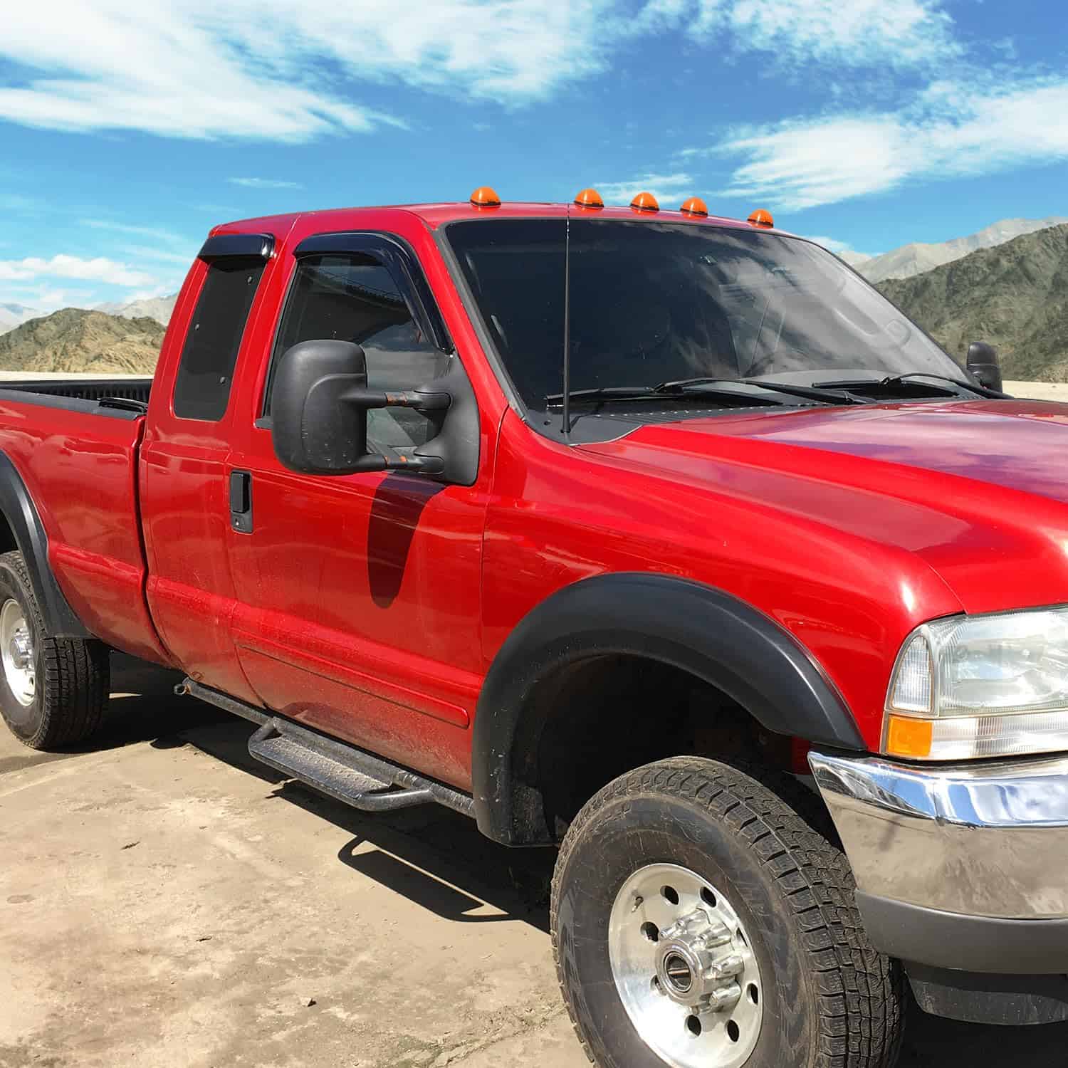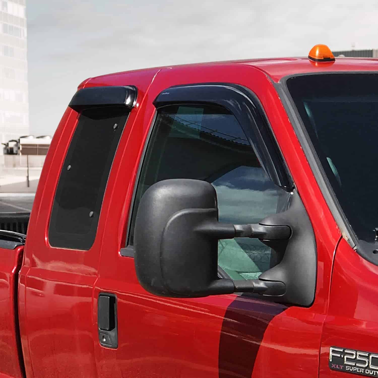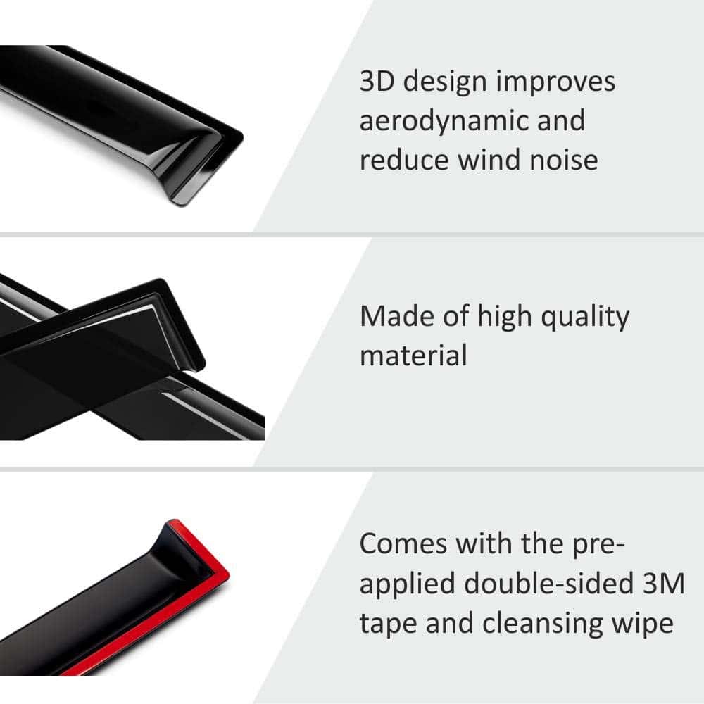 3. Deflectores de Ventana de Tamaño Completo – Este conjunto de 4 piezas incluye viseras de lluvia para el lado del pasajero y del conductor que crean un aspecto continuo que te protege de los rayos del sol, las gotas de lluvia y el viento mientras conduces con la ventana abajo.