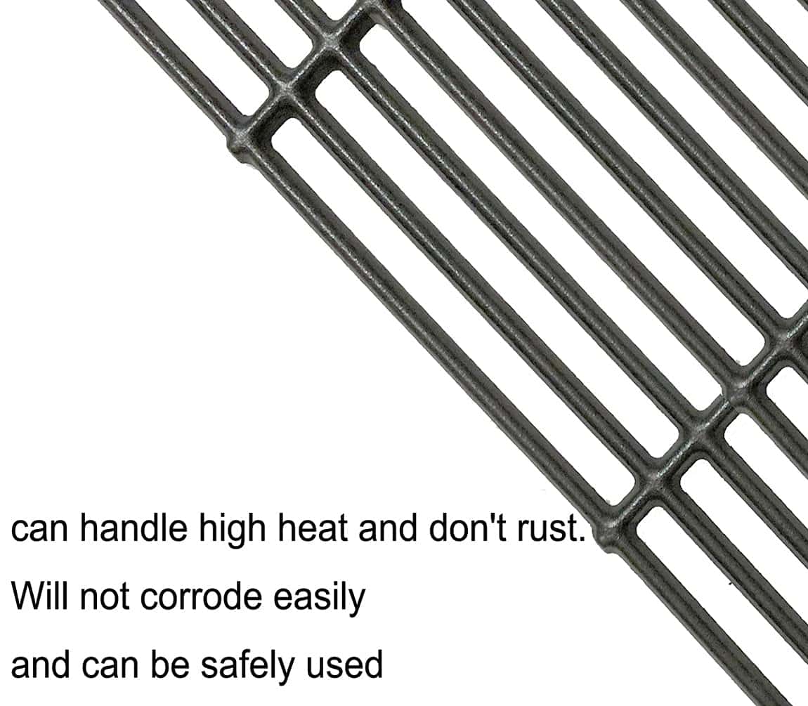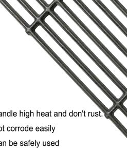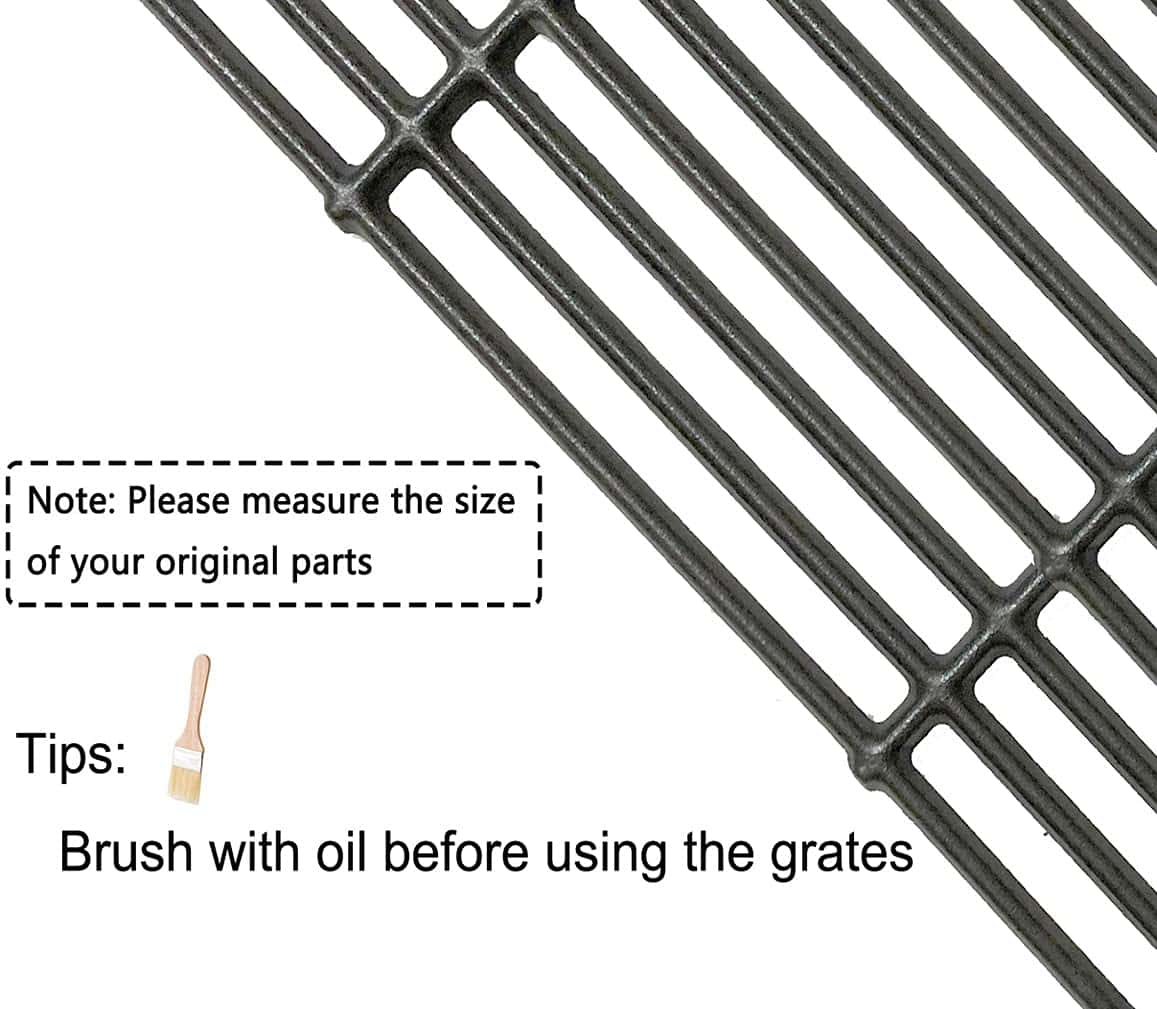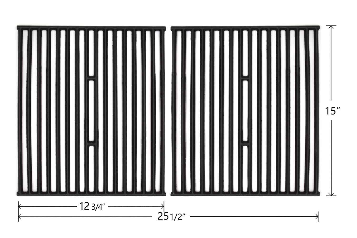 Este juego de 2 parrillas de hierro fundido de 15″ es compatible con varios modelos de parrillas de las marcas Broil King, Broil-Mate y Sterling. Fabricadas en hierro fundido mate, estas parrillas ofrecen un rendimiento duradero y resistente para todas tus necesidades de cocina al aire libre. Las dimensiones de cada parrilla son 15″ x 12 3/4″, con un total de 15″ x 25 1/2″ cuando se colocan juntas. Asegúrate de medir el tamaño de tus piezas originales y comparar con las nuestras antes de realizar el pedido. Este producto ha pasado pruebas SGS para cumplir o superar los estándares de la FDA.