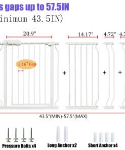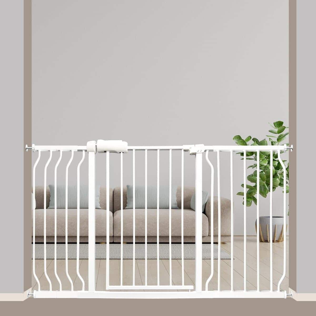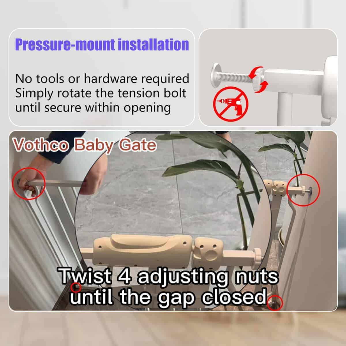 Vothco Barrera de Seguridad Extra Ancha para Bebés 53-57.5 Pulgadas, Montaje a Presión sin Taladrar, Cierre Automático para Puertas y Pasillos – Diseño de Metal para Niños y Mascotas, Blanco. Esta barrera de seguridad extra ancha de Vothco se adapta a aperturas de 52.8 a 57.5 pulgadas de ancho, ideal para puertas y escaleras. Con un espaciado estrecho de 2.16 pulgadas y una altura de 30 pulgadas, proporciona una mayor seguridad para niños y mascotas. Hecha de metal grueso, esta barrera es resistente y duradera, soportando hasta 120 libras de presión. Perfecta para una variedad de aberturas, se puede montar a presión en espacios extra anchos, como puertas grandes, pasillos y en la parte superior e inferior de las escaleras. Con un sistema de doble bloqueo, garantiza una mayor seguridad, siendo fácil de abrir para adultos pero difícil para los niños. La instalación es rápida y sencilla, sin necesidad de herramientas ni taladrar, manteniendo una apariencia moderna que combina con cualquier decoración. Con un diseño de apertura de 180 grados de dos vías, permite una entrada y salida fácil en ambas direcciones. La barrera se cerrará automáticamente al soltar la manija y permanecerá abierta si se abre más allá de 90 grados, evitando la necesidad de abrir y cerrar constantemente. Camine fácilmente a través de esta barrera con comodidad y seguridad.