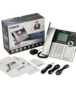 El VTech CM18445 – Consola Principal Teléfono de Oficina Pequeña Expandible de 4 Líneas DECT 6.0 con Sistema Contestador es un nuevo sistema de pequeñas empresas que facilita la conexión de su oficina. La instalación es simple. Solo la consola principal necesita estar conectada a líneas telefónicas analógicas. Los auriculares y escritorios se conectan de forma inalámbrica al sistema con un toque utilizando la tecnología DECT 6.0, para que pueda instalar un sistema de oficina completo en minutos. No se requiere asistencia profesional. Además, el VTech CM18445 – Consola Principal Teléfono de Oficina Pequeña Expandible de 4 Líneas DECT 6.0 con Sistema Contestador le permite crecer en un sistema telefónico completamente funcional con hasta 10 estaciones. La consola principal graba digitalmente hasta 180 minutos compartidos de mensajes entrantes, anuncios salientes y notas. El contestador automático para cada línea puede responder llamadas externas, proporcionar a los llamantes un directorio de la empresa y enrutar las llamadas a la extensión adecuada.