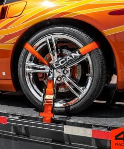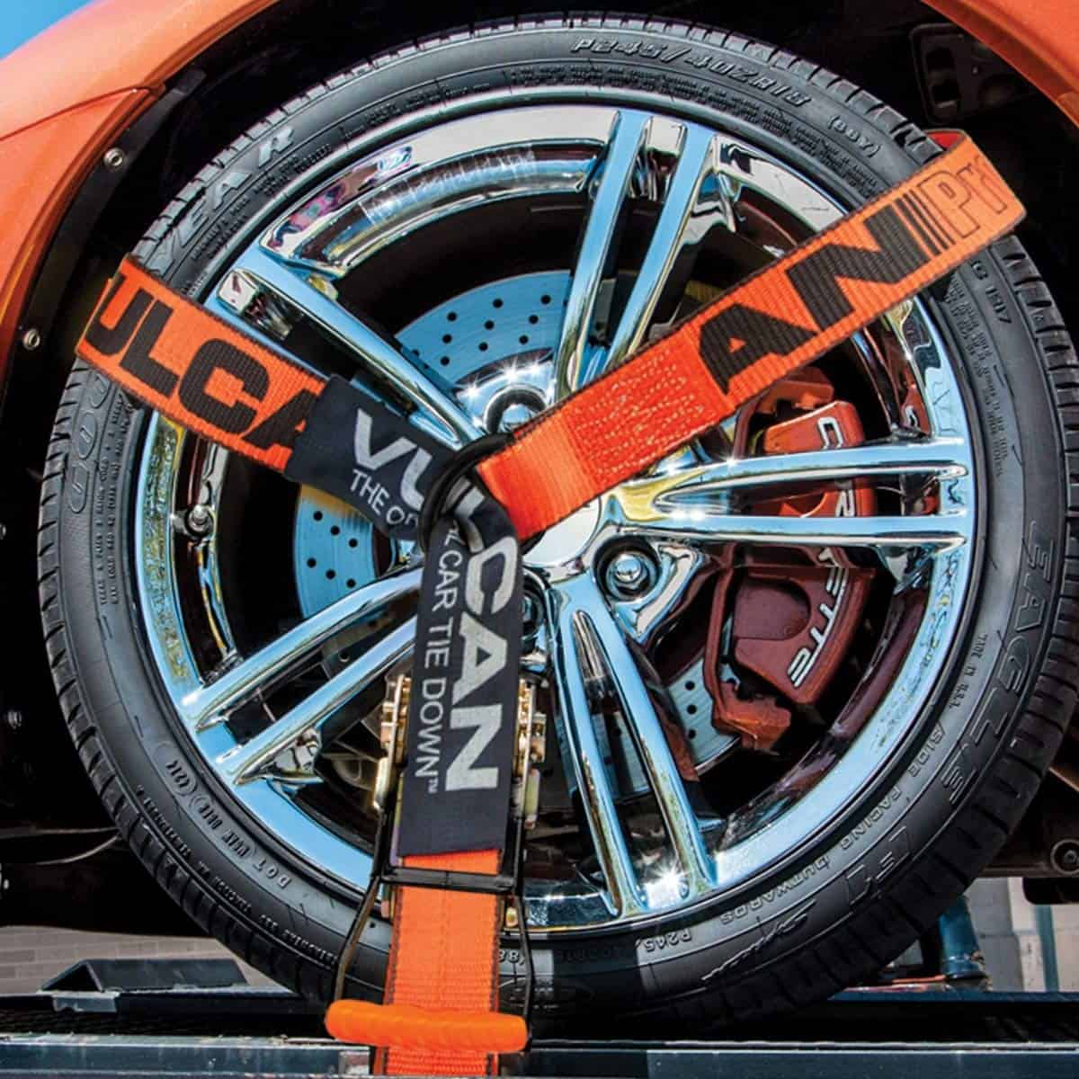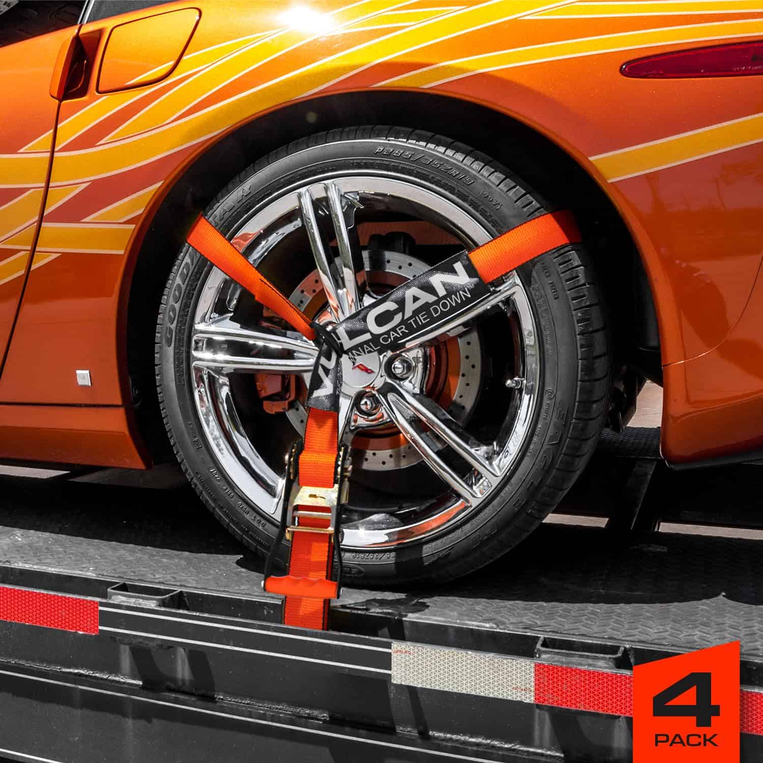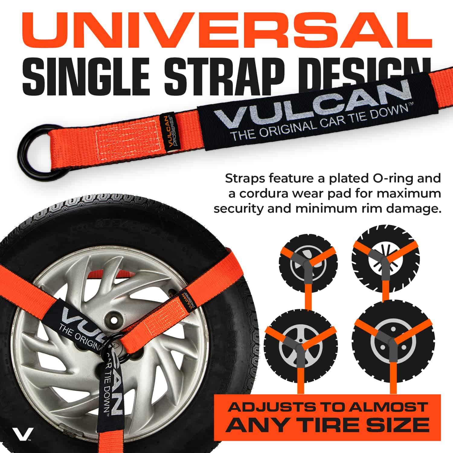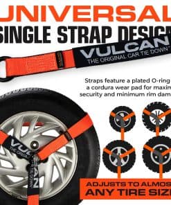 Los operadores profesionales eligen los sistemas de amarre de automóviles de Vulcan para transportar millones de vehículos cada año. Vulcan es reconocido como el fabricante de amarres de automóviles más calificado y experimentado del mundo. Remolque fácilmente cualquier automóvil, camión, SUV, Jeep o deportivo. Diseñado para usar en remolques de plataforma plana, elevadores de ruedas y remolques de arrastre. Las correas cuentan con un diseño de lazo universal que se ajusta automáticamente a la mayoría de los neumáticos. Los arneses de estilo lazo con anillas lisas funcionan con remolques de plataforma plana y muchos elevadores de ruedas y remolques de arrastre populares. La correa extra gruesa de 2 pulgadas x 96 pulgadas, de color naranja óptico extra duradera de la serie PRO de VULCAN, es un 67% más resistente a la abrasión y un 30% más resistente al corte. Los bordes están tratados con una fibra de plástico ultra duradera para una máxima durabilidad y una vida útil extra larga. Cada correa tiene una anilla plateada y una almohadilla de desgaste de cordura para una máxima seguridad y un mínimo daño a la llanta. Cada correa también incluye una hebilla de trinquete con gancho de resorte plateado para una resistencia extra y resistencia a la intemperie. El gancho de resorte proporciona una conexión segura a anillas en D, rieles laterales o bolsillos de estaca. La carga de trabajo segura es de 3300 libras. Cumple o supera todos los requisitos del DOT. Nota: Siempre asegure cualquier vehículo para su transporte con cuatro puntos de amarre.