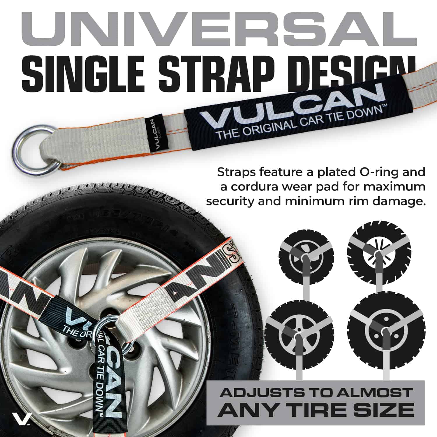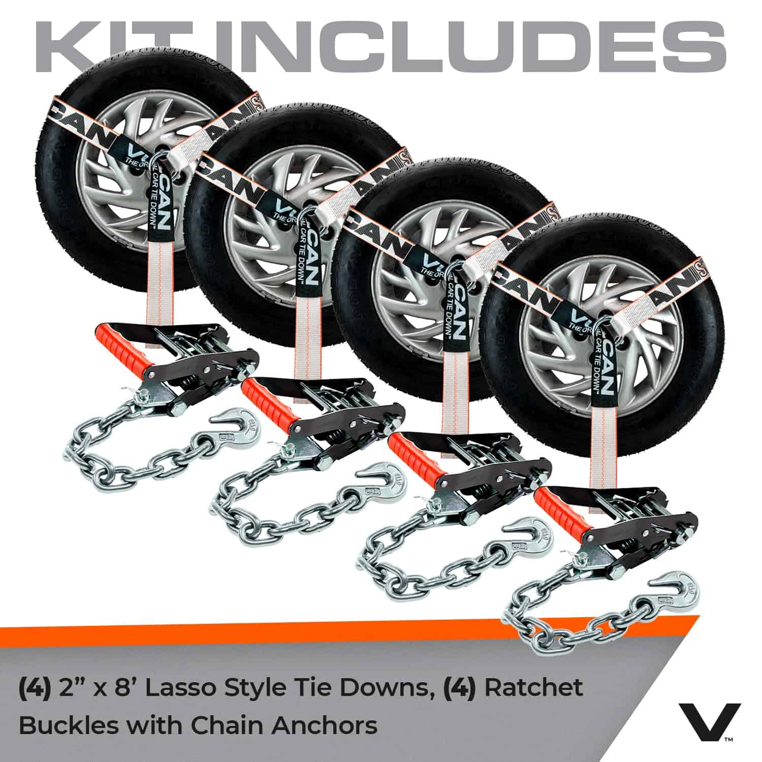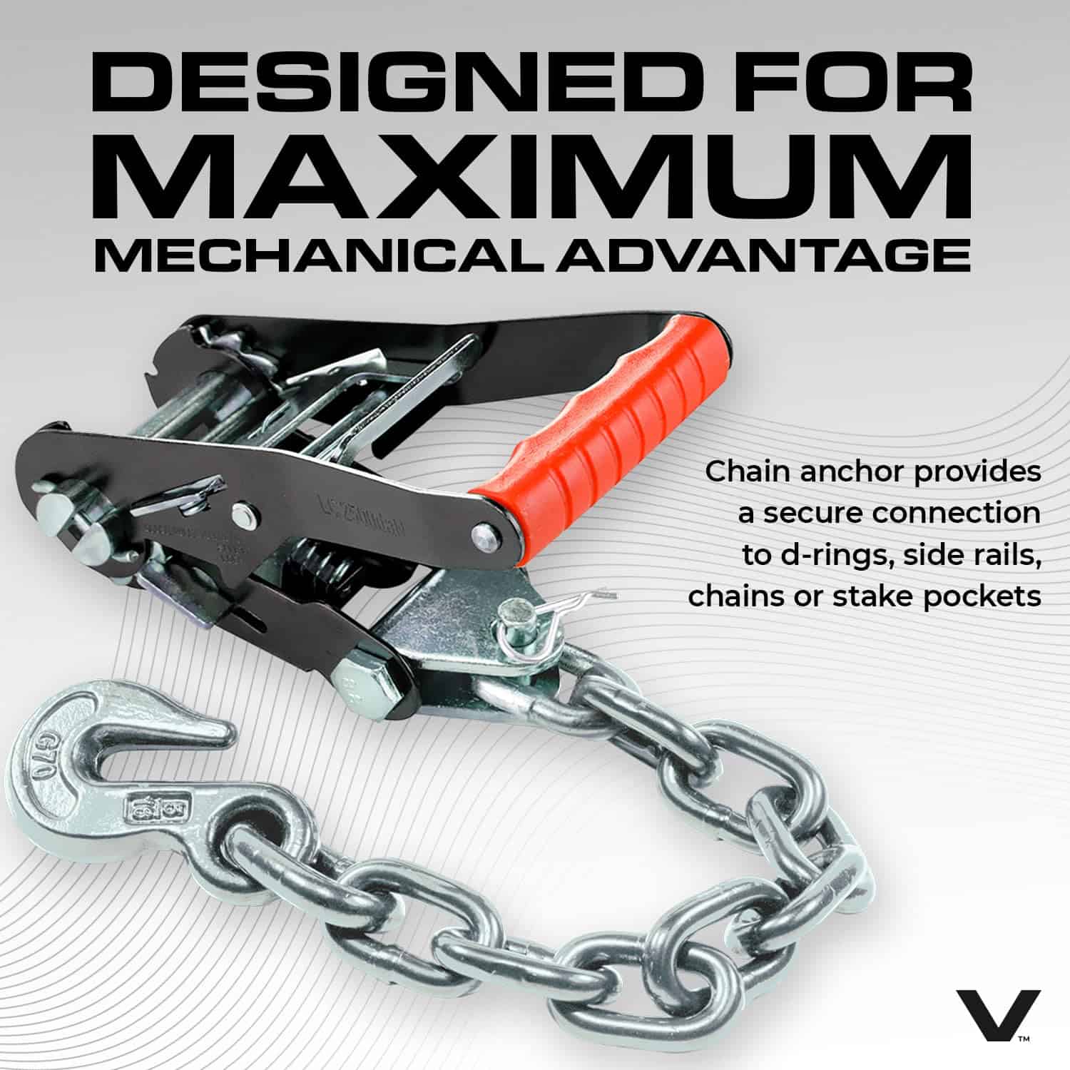 La correa de amarre para coche Vulcan con anclajes de cadena en estilo lazo es la solución perfecta para asegurar de manera segura su carga durante el transporte. Con una capacidad de carga de trabajo segura de 3,300 libras, puede estar tranquilo sabiendo que sus pertenencias estarán firmemente sujetas durante el viaje.