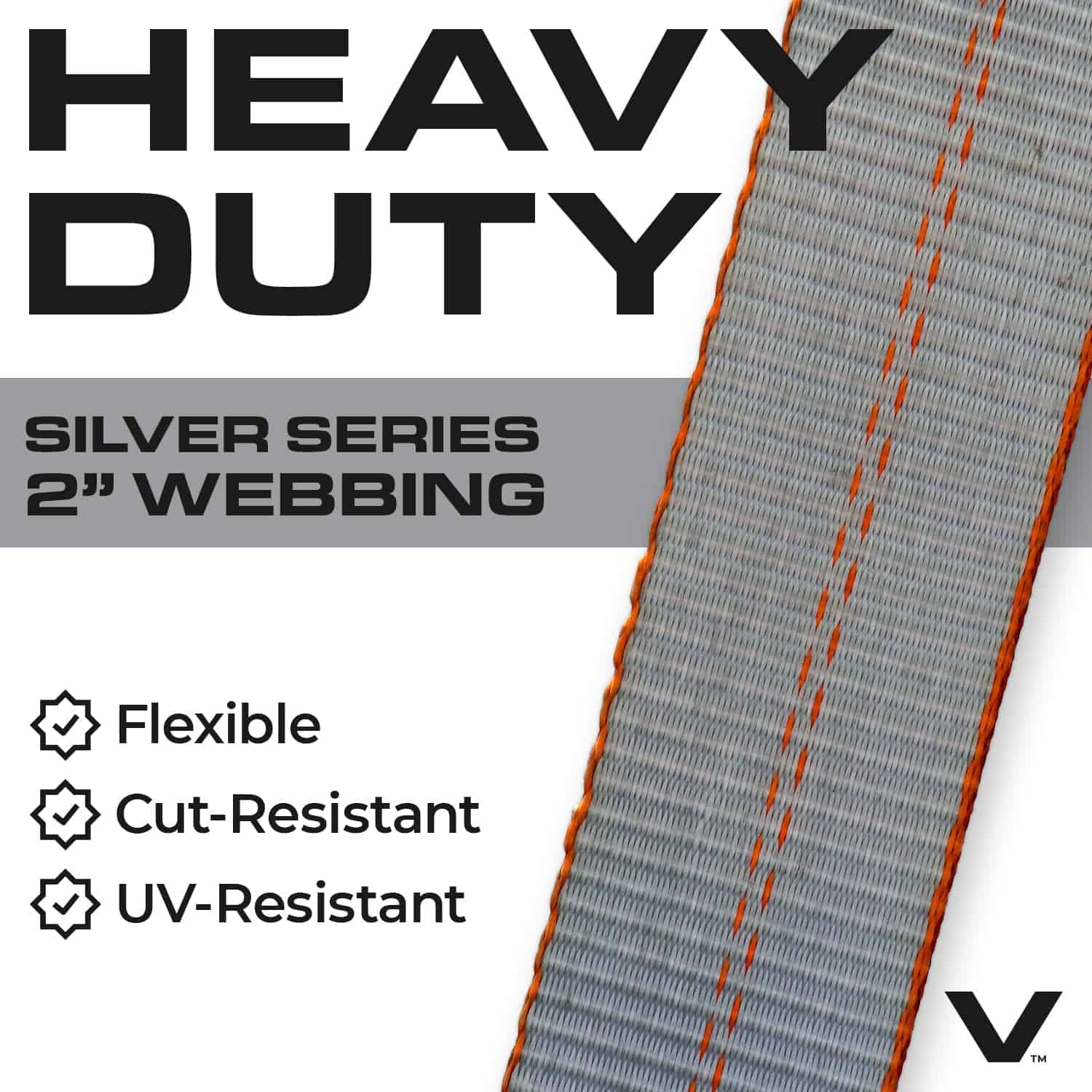 La cinta exclusiva de la serie Silver de Vulcan no solo proporciona un aspecto profesional, sino que también es extremadamente resistente y fácil de manejar. La cinta gruesa es más fuerte que la cadena y proporciona una mayor suavidad a la carga transportada, evitando daños innecesarios.