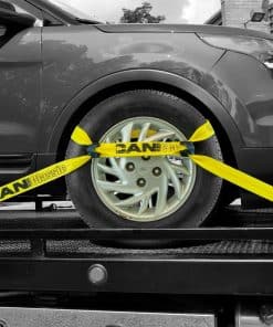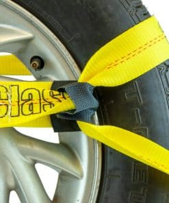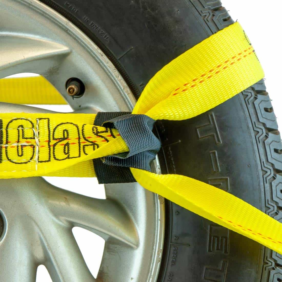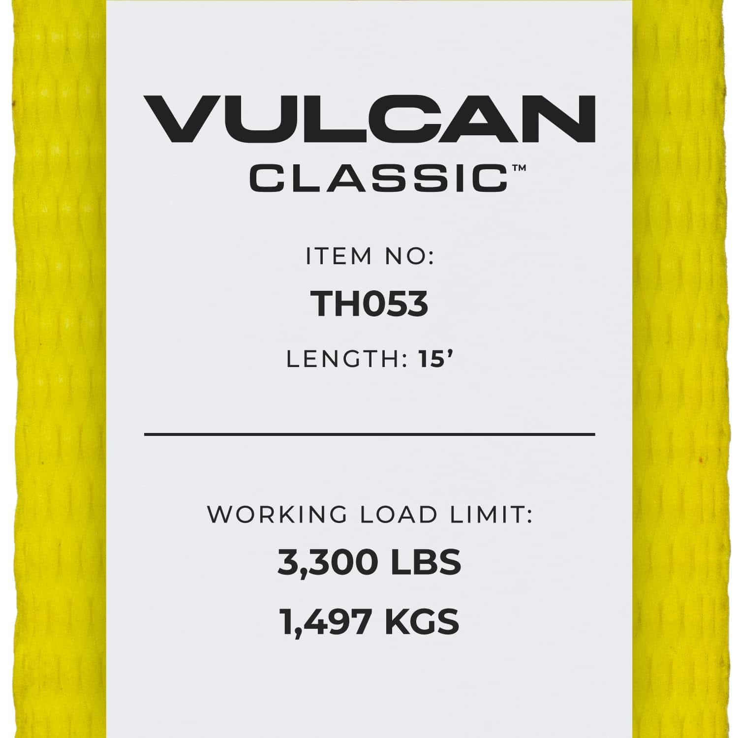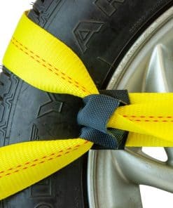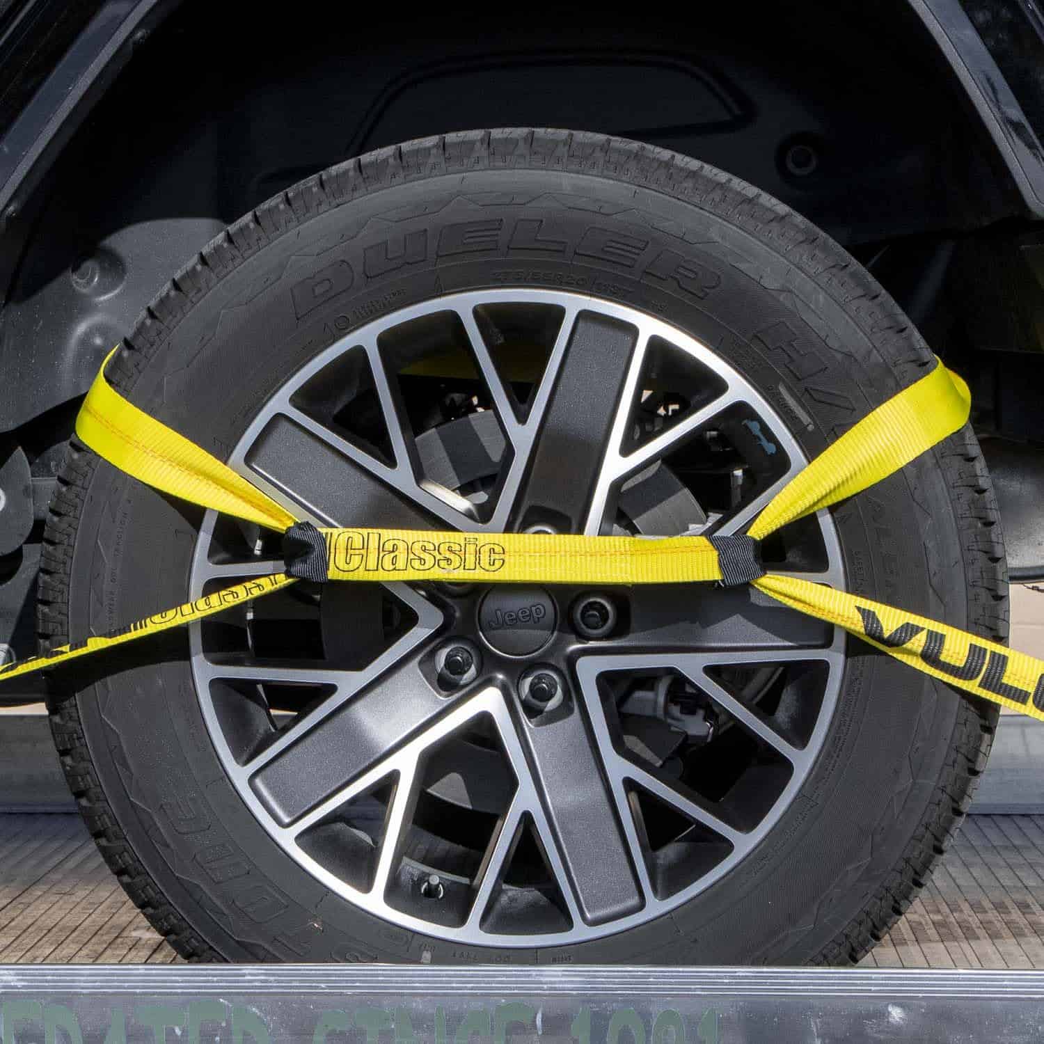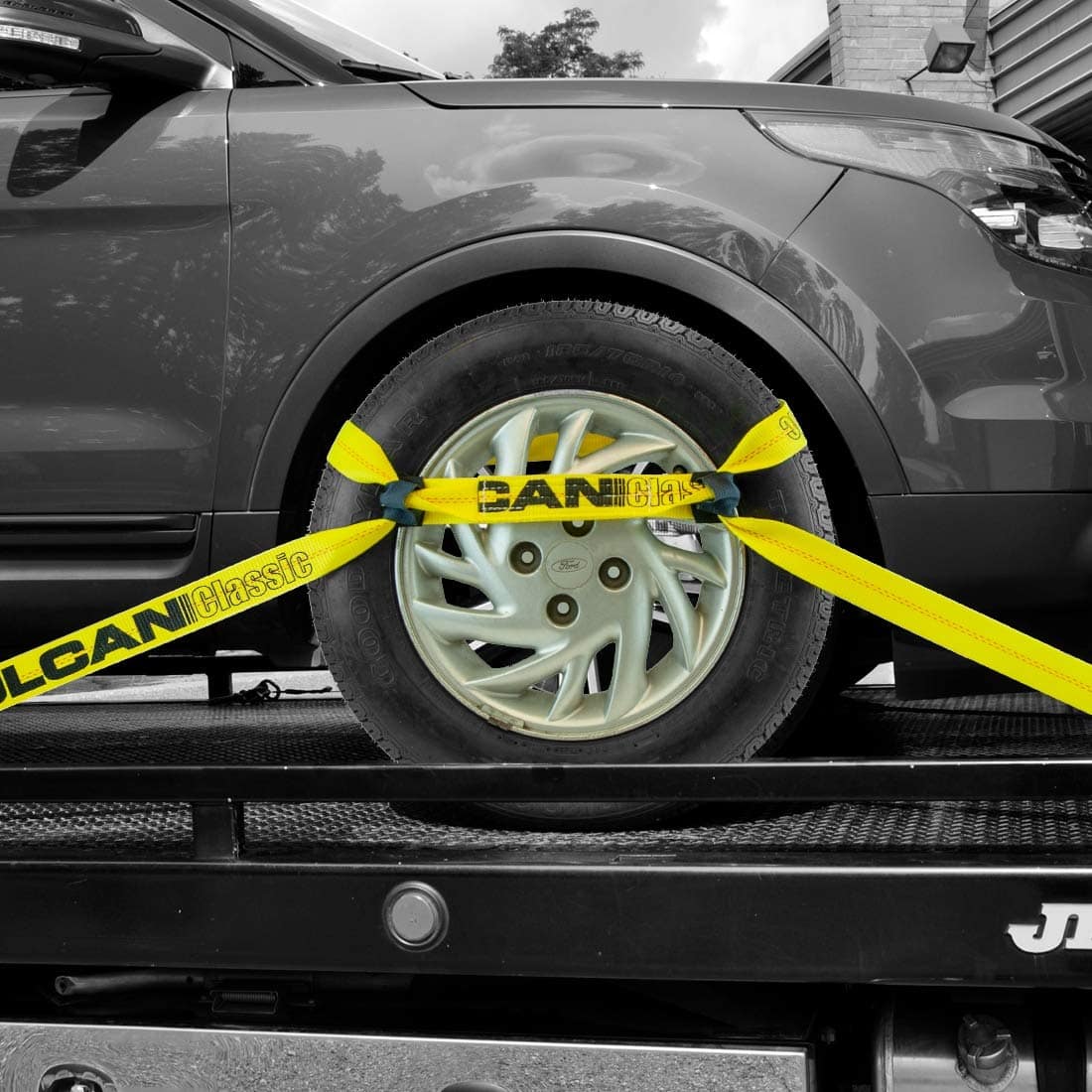 Los operadores profesionales de camiones, remolques y transportistas de vehículos eligen los sistemas de amarre de automóviles de Vulcan para transportar millones de vehículos cada año. Vulcan es reconocido como el fabricante de amarres de vehículos más calificado y experimentado del mundo. Estas correas proporcionan un transporte sin rayones porque ninguna parte metálica entra en contacto con las llantas o el vehículo. Trabaje con confianza, sabiendo que este paquete de cuatro amarres de 8 puntos transportará su vehículo de forma segura. VULCAN es una empresa de propiedad familiar y estadounidense con sede en Detroit, Michigan, desde 1959. Siempre hemos sido una empresa familiar y ahora estamos en nuestra cuarta generación de expertos en suministros para camiones y remolques. Asegúrese de saber de quién está comprando. Elija la empresa con sede en EE. UU. que diseñó los productos originalmente. Elija VULCAN. El tejido amarillo clásico de Vulcan es duradero, resistente al corte y tratado para resistencia a los rayos UV. El tejido de poliéster tiene un patrón especial de tejido que agrega resistencia, proporcionando una capacidad de rotura de 12,000 lb, que es significativamente mayor que el tejido de amarre estándar. Estos sistemas de amarre para automóviles de alta resistencia incluyen una correa de 15 pies de largo con una cola de cadena, una correa transversal de 14″ que va al frente del neumático y un tensor con una cola de cadena. El tejido de amarre de poliéster de 2» certificado está recubierto para resistencia a los rayos UV y al corte, y diseñado específicamente para transportar cargas en remolques. Los tensores tienen mangos moldeados ergonómicamente. Las colas de cadena se ajustan perfectamente en ranuras en T, ganchos y ojos de banjo. Los tensores plateados de zinc-dicromato son resistentes a la intemperie y muy fuertes. Los mangos ergonómicos brindan un agarre superior y comodidad, y el perfil ancho permite un uso fácil incluso usando guantes. El diseño de «ajuste automático» se ajusta alrededor del neumático para una carga rápida, y se ajusta a casi cualquier neumático de un automóvil, SUV o camioneta liviana. Estas correas de neumáticos están diseñadas para transportar cualquier vehículo en un remolque o camión de volteo, y permiten que el vehículo viaje sobre su propia suspensión, eliminando la transferencia de choque. Puede asegurar fácilmente el vehículo para el transporte mientras está de pie en el suelo para mayor seguridad. Cada conjunto tiene una carga de trabajo segura de 3.300 lb que está marcada en la etiqueta de advertencia de cada correa para una inspección fácil, y todas las correas de Vulcan cumplen con todas las especificaciones de CVSA y DOT.