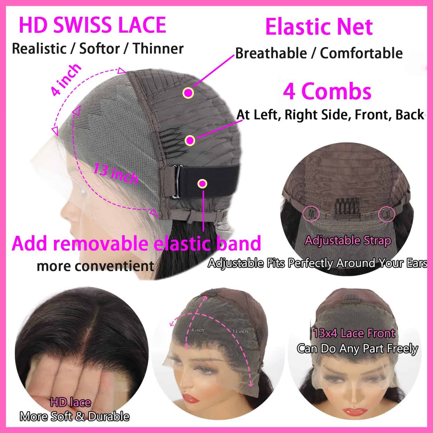 1. Material de Peluca Bob de Cabello Humano 100% Sin Procesar Brasileño, peluca de encaje frontal de cabello humano brasileño recto 13×4 180 Densidad Pelucas de Encaje, que son suaves, saludables y suaves. Sedoso, suave y saludable, completo y grueso, uso cómodo.
