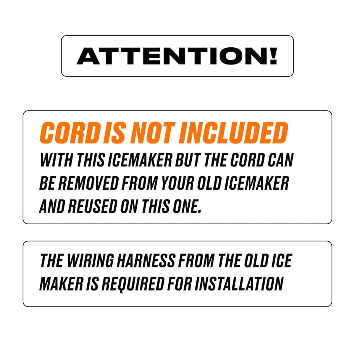 1. VEA EL VIDEO DE INSTRUCCIONES DE REEMPLAZO en YouTube: Conjunto del Fabricante de Hielo WPW10300022 EL CABLE NO ESTÁ INCLUIDO con este fabricante de hielo, pero el cable se puede quitar de su antiguo fabricante de hielo y reutilizarse en este. Incluido: 1 Tapa de Cabeza, 1 Brazo Baleador, 1 Canal de Agua, 1 Instrucciones de Instalación.