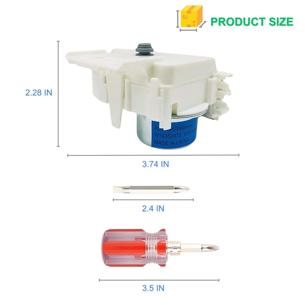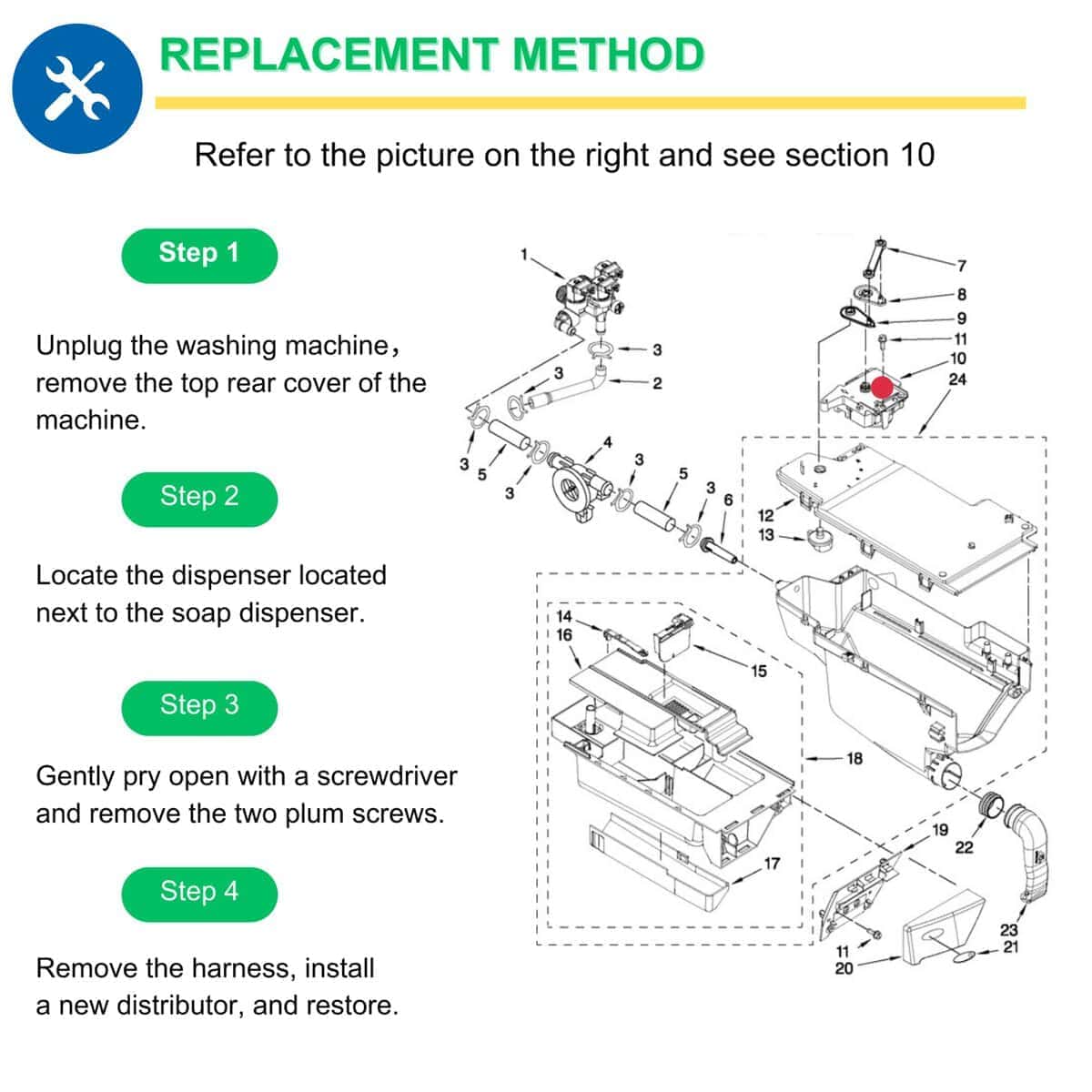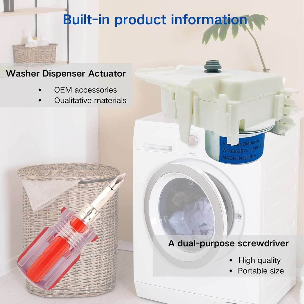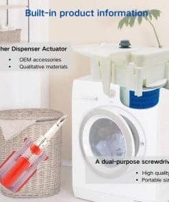 3. Notas de instalación: Asegúrese de desenchufar la máquina y cerrar el suministro de agua antes de quitar la tapa superior y los tornillos que aseguran el actuador, El reemplazo restaura la eficiencia y funcionalidad del sistema de dispensación de su lavadora. Para reemplazarlo, puede necesitar un destornillador y un llave.