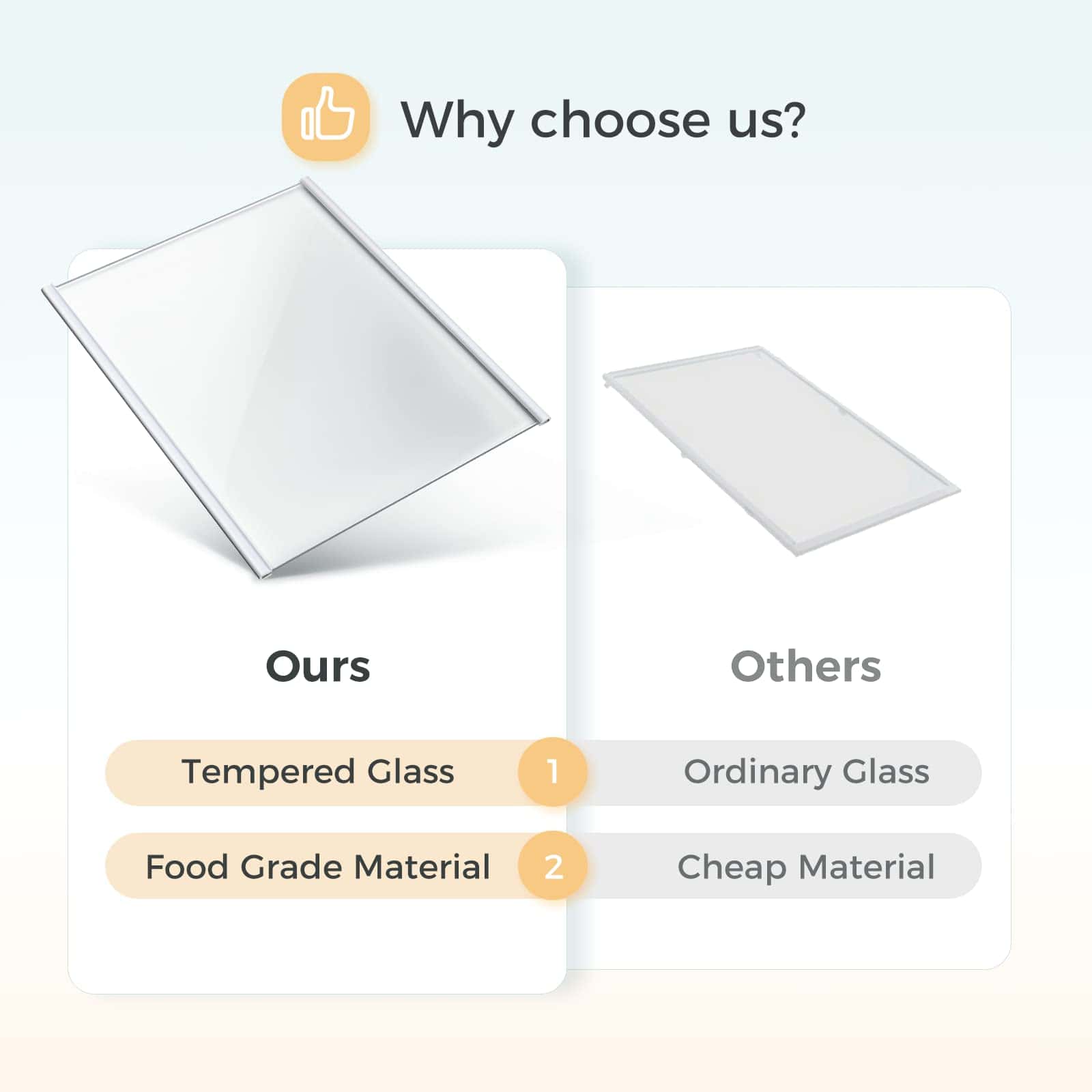 El marco del estante de vidrio para congelador de alta calidad W11130203 está hecho de material duradero de vidrio templado de alta calidad, sin contaminación, más seguro y más fuerte, garantizado para superar las especificaciones OEM. El número de parte del estante de vidrio se ajusta al lado del congelador. Reemplaza estas piezas: W10527849, W10773887, WPW10527849, AP6262440, PS12347522, EAP12347522, 4545866. Tamaño del producto 11.37″ de ancho x 9.88″ de profundidad. Si no está seguro de si esto es compatible con su refrigerador, envíenos un mensaje y podemos confirmar las piezas correctas para su refrigerador. Notas de compra El estante de vidrio W11130203 solo es compatible con algunos modelos de refrigeradores Whirlpool, etc., en lugar de todos. Asegúrese de confirmar en detalle antes de comprar, Nuestras imágenes y páginas de detalles tienen instrucciones muy detalladas.