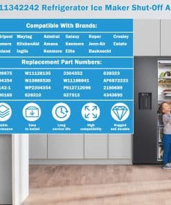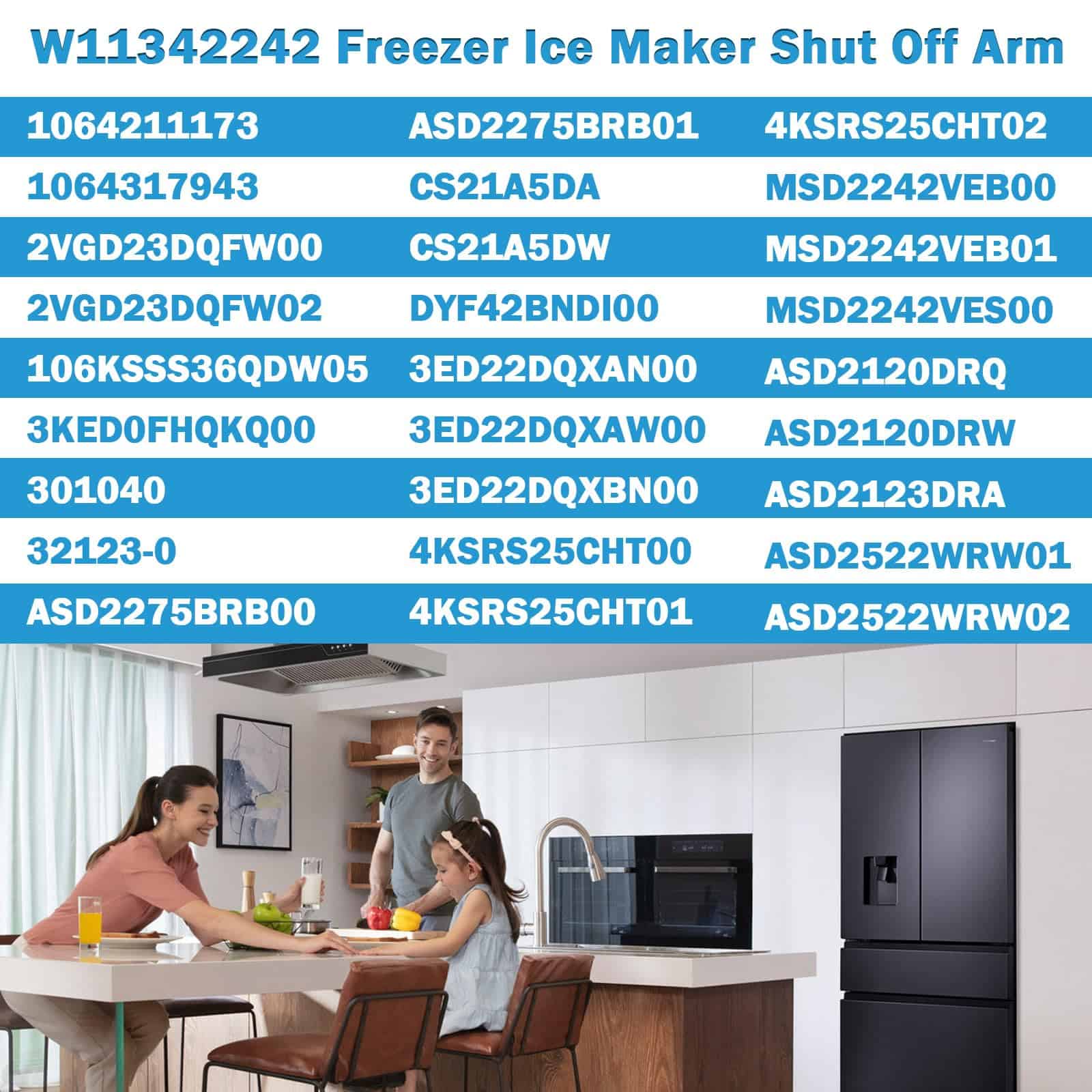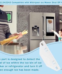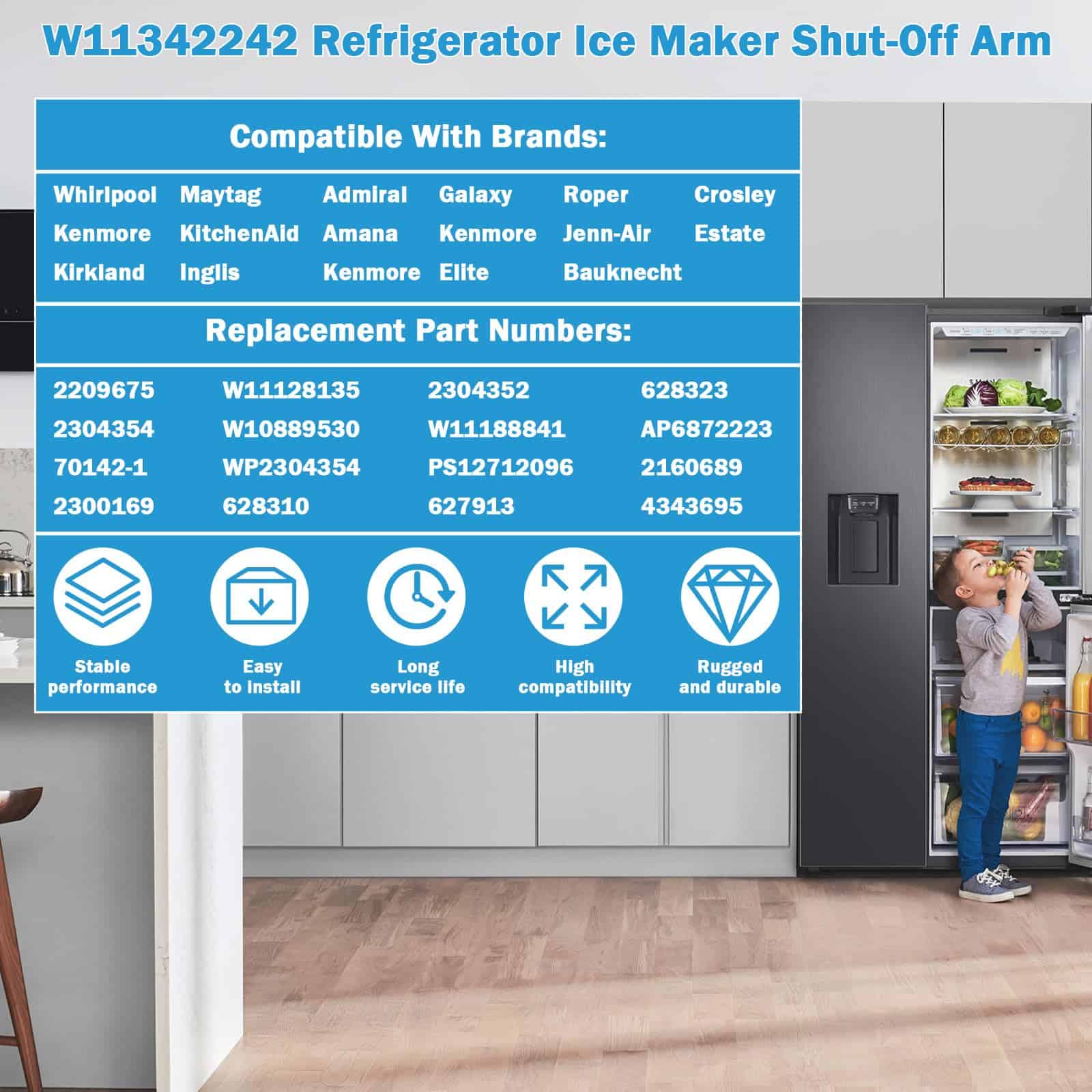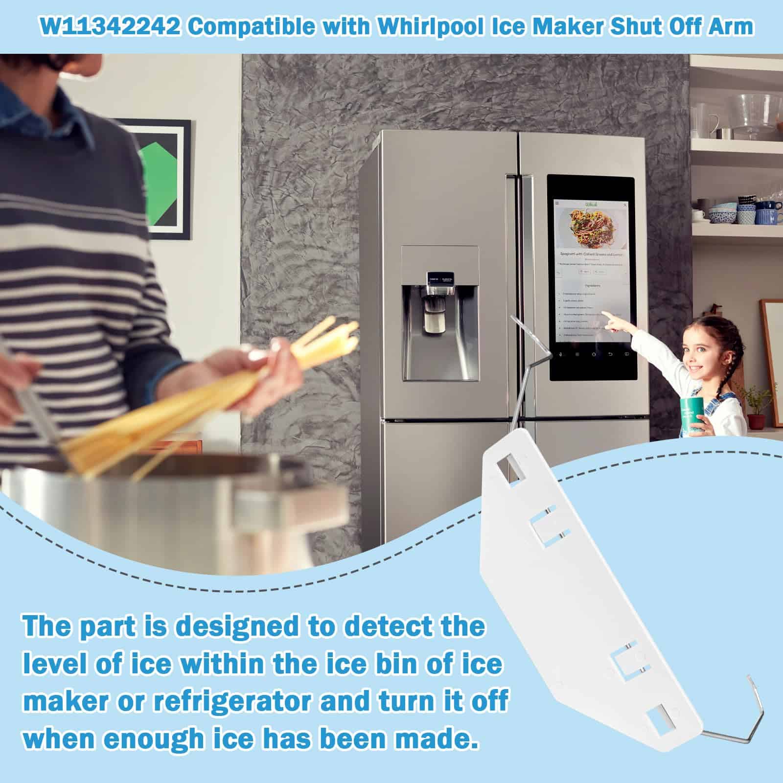W11342242 Refrigerator Ice Maker Shut-Off Arm Compatible with Whirlpool Kenmore Maytag KitchenAid. The W11342242 Ice Maker Shutdown Arm is constructed of durable plastic and metal for consistent performance and long life. It is designed to detect the amount of ice in the ice maker or refrigerator ice bucket and shut off the ice maker when enough ice has been produced. This replacement part is compatible with various models of Whirlpool, Maytag, KitchenAid, Kenmore ice makers. Easily solve common ice maker problems like not making ice, making too much ice, or not shutting off by replacing part W11342242. Installation is straightforward, requiring the disconnection of power and turning off the ice maker before replacing the leveling arm with the new W11342242 assembly.