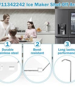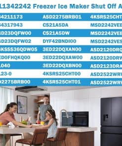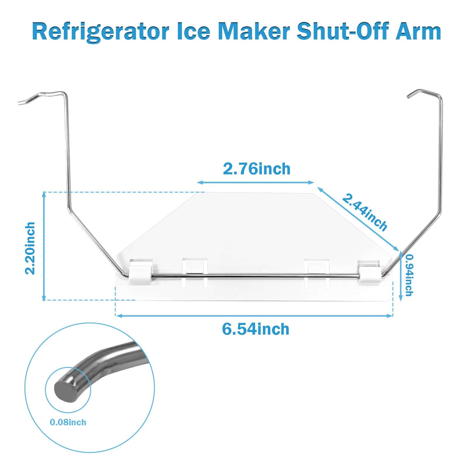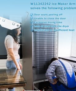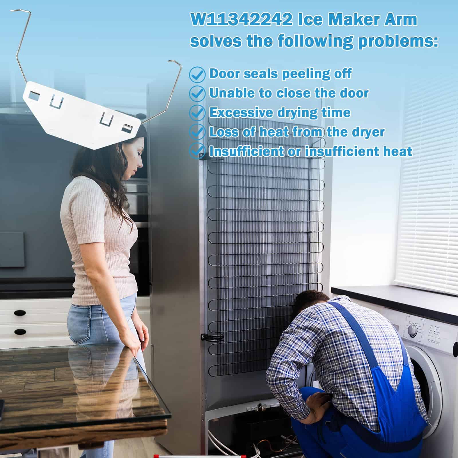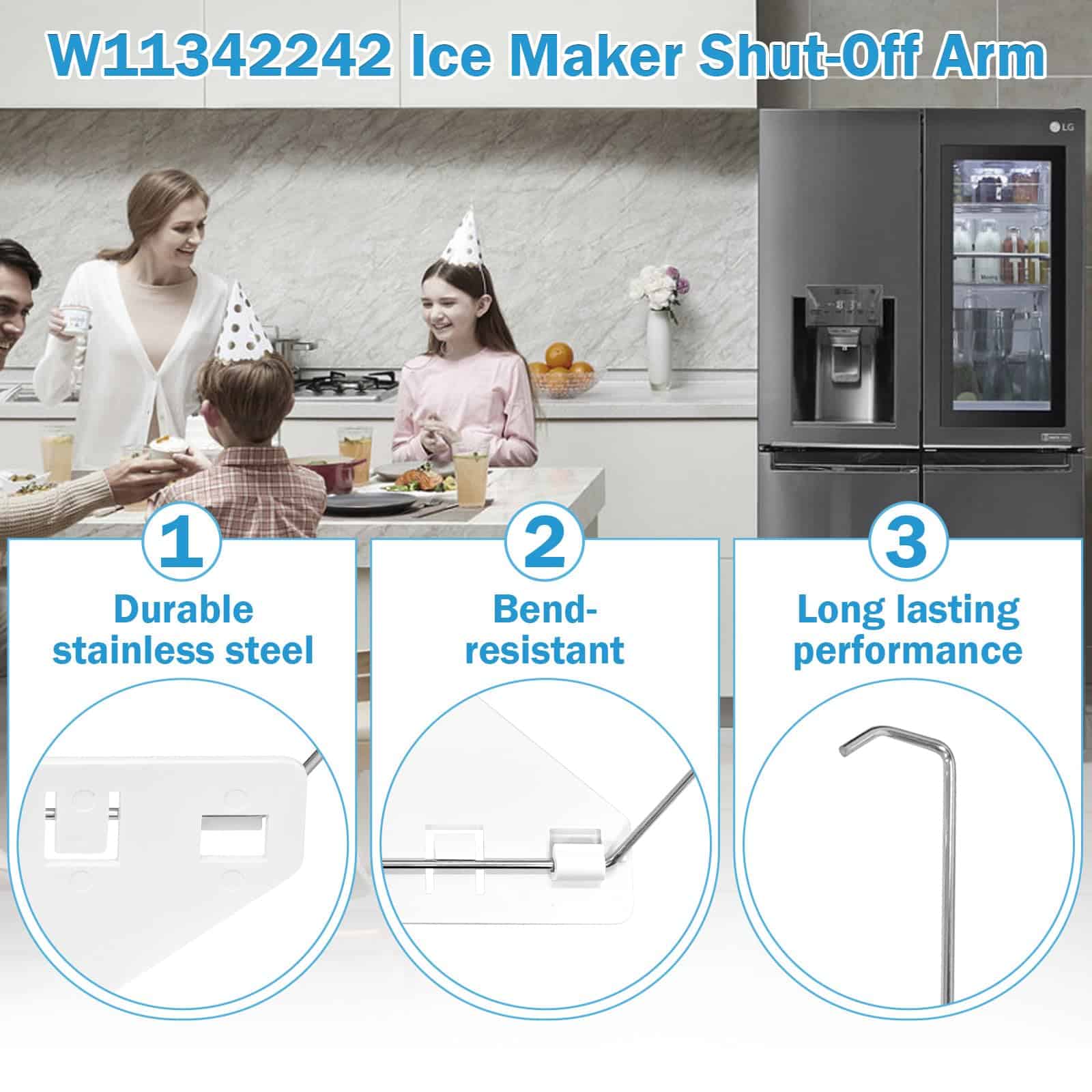 W11342242 Refrigerator Ice Maker Shut-Off Arm Compatible with Whirlpool Kenmore Maytag KitchenAid. The W11342242 Ice Maker Shutdown Arm is constructed of durable plastic and metal for consistent performance and long life. It is designed to detect the amount of ice in the ice maker or refrigerator ice bucket and shut off the ice maker when enough ice has been produced. This replacement part is compatible with various models of Whirlpool, Maytag, KitchenAid, Kenmore ice makers. Easily solve common ice maker problems like not making ice, making too much ice, or not shutting off by replacing part W11342242. Installation is straightforward, requiring the disconnection of power and turning off the ice maker before replacing the leveling arm with the new W11342242 assembly.