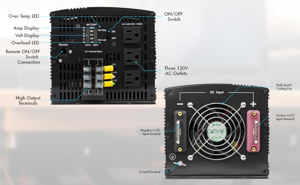 1. POTENTE INVERSOR – 3000 vatios de potencia continua verdadera y 6000 vatios de potencia máxima de sobretensión. 2. CARACTERÍSTICAS IMPRESIONANTES – 3 tomas de corriente alterna de 120V y 1 bloque terminal de alta potencia. 3. GRAN PROTECCIÓN – ofrece protección contra sobrecargas, protección contra sobrecalentamiento, apagado automático por batería baja. 4. ALTO RENDIMIENTO DE ALTA CALIDAD – Tarjeta de circuito de montaje superficial con transistores MOSFET Eficiencia y Fiabilidad incomparables. 5. Incluye control remoto