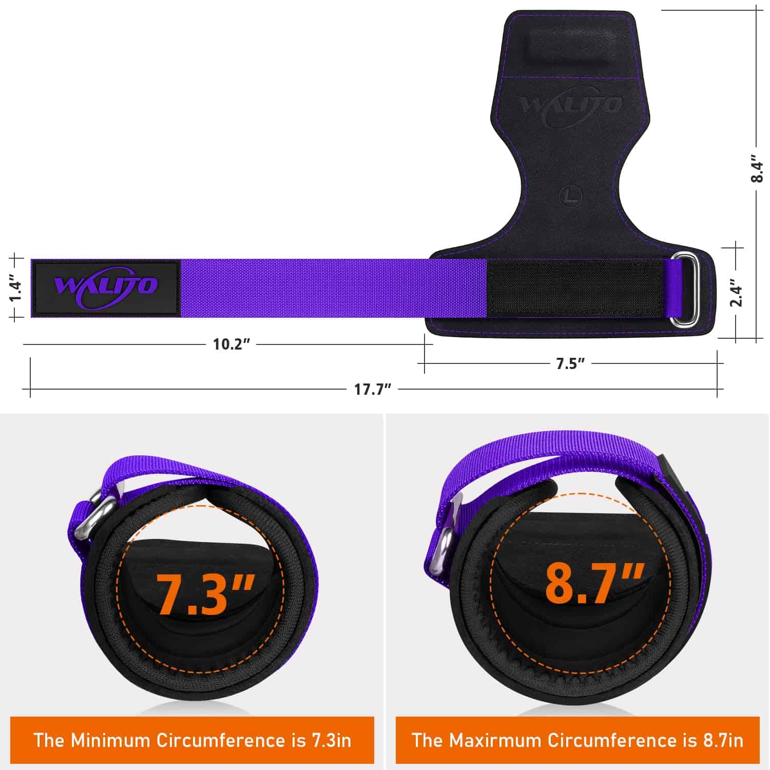Tamaño perfecto de las correas de muñeca para levantamiento de pesas – El cuero de nuestras correas de gancho para muñecas de gimnasio mide 8.46 pulgadas de largo y puede adaptarse a diferentes tamaños de palmas. La longitud ajustable de gancho y lazo de alta densidad es de 16.7 pulgadas y se adapta a circunferencias de muñeca de 6.3 pulgadas a 8 pulgadas.