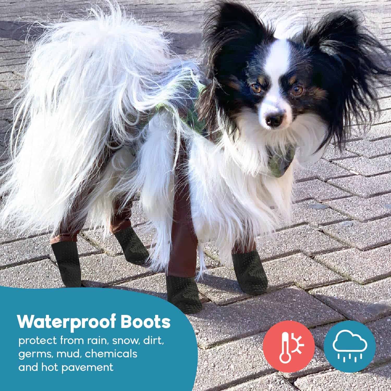 Walkee Paws son las primeras patas de botas para perros del mundo diseñadas para ser unas botas mejores. Son fáciles de poner y se mantienen gracias a nuestro diseño patentado sobre la espalda. Cada par presenta tejido elástico de cuatro direcciones para la máxima comodidad canina, además de suelas de goma impermeables para proteger a su cachorro de todo lo rudo afuera. Sabemos que usted y su perro amarán Walkee Paws; sin embargo, entienda que puede llevar unos intentos a ambos para acostumbrarse a las patas. ¡Su perro puede caminar de forma divertida o quedarse congelado al principio, pero eso es totalmente normal! ¡Solo dale un ligero tirón de la correa para salir a la calle, y pronto olvidará que las está usando siquiera. Y una vez que haya ajustado el ajuste perfecto, estará listo y no necesitarás ajustarlos cada vez. ¡Feliz paseo!
