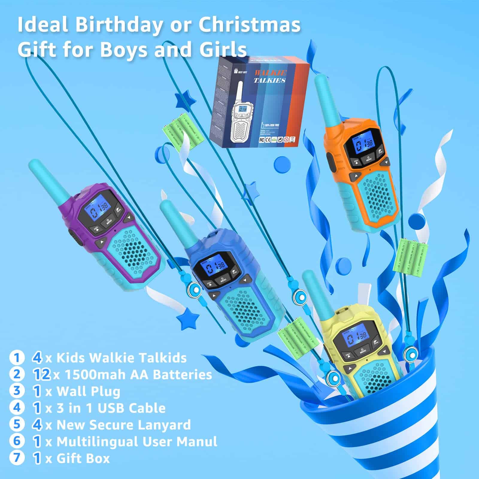 1. No necesitas seguir comprando pilas nuevas: Puedes tener 1 x Manual de Usuario, 2 x Walkie Talkies Familiares, 1 x Caja de Regalo Exquisita. El walkie talkie de juguete Woktok es adecuado para 3 x pilas aa recargables de 1000mah, que permiten un funcionamiento continuo de 48-72 horas, recargable por computadora, cargador de coche o power bank. Económico, respetuoso con el medio ambiente, carga en cualquier lugar y momento, más conveniente para que los niños carguen antes de hablar.