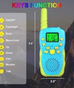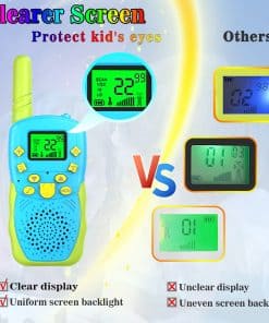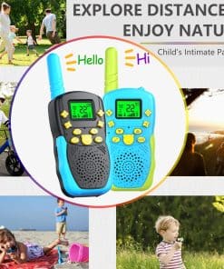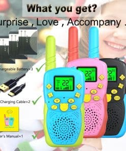 ¡Bienvenido a la tienda POKPOW! Estos walkie talkies para niños son una versión mejorada, con una distancia efectiva de comunicación de hasta 3 KM (en campo abierto). Con una pantalla LCD brillante, linterna integrada, conexión de auriculares, función de ahorro de energía y clip para cinturón. Es el mejor regalo de cumpleaños, Navidad para tus hijos. DESCRIPCIÓN 1. Distancia de comunicación efectiva: MAX 3KM 2. Reducción automática de ruido 3. Simulación de grupo en silencio 4. Potencia de transmisión: 0.5W (frecuencia de seguridad civil, sin interferencias ni radiación) 5. Selección de 10 tonos de llamada 6. Alimentado por: Batería de polímero de litio recargable 7. Función de voz manos libres 8. Canales disponibles: 22 PAQUETE INCLUIDO 2 x Walkie Talkies 1 x Manual de Usuario 2 Batería de polímero de litio 1 Cable de Carga USB ADVERTENCIA Y PRECAUCIÓN 1. No apto para niños menores de 3 años. 2. Mantener los walkie talkies secos y alejados de la humedad. 3. Utilizar un adaptador de buena calidad. GARANTÍA Ofrecemos 60 días de reemplazo o reembolso; 1 año de garantía (daños físicos y daños causados por un uso incorrecto excluidos).