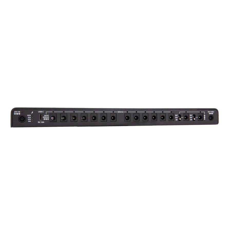 El Canvas Power 15 tiene 15 salidas de alimentación aisladas que proporcionan hasta 500 mA de energía limpia a 9v. Dos de las salidas admiten voltaje variable, permitiéndote cambiar entre 9v, 12v y 18v para alimentar pedales de alto voltaje. También incluye un puerto USB-C para alimentar dispositivos como tu teléfono o tableta mientras tocas. Las fuentes de alimentación Canvas Power aportan simplicidad y modularidad a la alimentación de tu pedalera. Al suministrar hasta 500 mA de alimentación aislada y silenciosa a 9V a cada salida, estas fuentes de alimentación son perfectas para la pedalera moderna. La serie Canvas Power está construida con arquitecturas de suministro de conmutación modernas. Esto significa que cada salida está aislada, es altamente eficiente y está ampliamente filtrada, lo que garantiza que suministren una gran cantidad de energía con un ruido increíblemente bajo. Cada modelo está disponible para su compra como fuente de alimentación independiente o como unidad vinculable a otra fuente a través de un enlace de alimentación de 24 V, lo que permite que Canvas Power crezca con tus necesidades de energía sin agregar otro cable que debas enchufar en la pared. El diseño superdelgado permite que las fuentes de alimentación Canvas Power se ajusten debajo de casi cualquier pedalera, y los soportes de montaje universales incluidos significan que no tienes que preocuparte por que tu fuente de alimentación se mueva cuando te estás apresurando hacia tu próximo concierto. El medidor de energía LED integrado te permite ver claramente cuánta energía queda, y cada salida tiene su propio indicador LED que te avisa cuando está enviando energía. También hemos desarrollado cables de barril personalizados de 2.1 mm con un conector de 90 grados en un extremo y nuestro nuevo conector recto súper corto en el otro, lo que te brinda la máxima flexibilidad para insertar estas fuentes de alimentación en espacios reducidos. Por supuesto, también aceptan cables de barril estándar de 2.1 mm, pero no serán tan geniales.