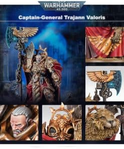 Este kit de plástico multi-parte contiene los componentes necesarios para ensamblar al Capitán General Trajann Valoris. Su armadura es elaborada y llamativa incluso entre sus hermanos Custodes lleva la Placa del Castellano, una antigua armadura motorizada que incorpora una placa inclinada heráldica adornada con un emblema de cabeza de águila y grandes plumas. Incluye una llamativa capa hecha de la piel de un león, tejida con hilo de adamantium la cabeza y las patas delanteras del león están drapadas de forma dramática sobre su hombro derecho. Un halo auramita enmarca su ceño fruncido, y todo el traje está cubierto con los detalles esculpidos ornamentados que distinguen a los Adeptus Custodes de otros guerreros imperiales águilas, piedras preciosas y filigranas adornan cada superficie. Su arma principal sostenida en su mano derecha es el Hacha del Vigilante, una enorme alabarda que incorpora un feroz arma de rayos de maestría conocida como el Grito del Águila; también lleva un misericordia y una reliquia antigua en su cinturón conocida como el Grillete del Momento.