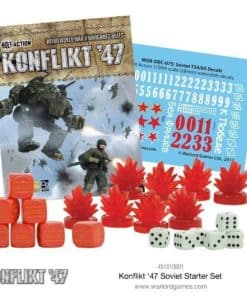 March 1947. A medida que Europa emerge de la peor invierno en la memoria, la máquina de guerra soviética está repuesta y lista para la acción. 1946 no fue el mejor año para La Madre Patria, aunque los invasores alemanes fueron rechazados en sus intentos de invadir. Después de los reveses ocurridos antes de que llegara el invierno, la maquinaria de guerra soviética está lista para avanzar hacia el oeste y aplastar a los enemigos alemanes ante ellos. Los incansables esfuerzos de valientes científicos soviéticos han significado que la tecnología del enemigo ahora está disponible en su contra. El andador cosaco es rápido y lleva un cañón pesado, capaz de derrotar a sus contrapartes de reconocimiento a distancia, y los nuevos trajes de infantería pesada pueden destrozar infantería o vehículos con igual facilidad. Aún más temible es el cañón de pulso sónico que ha sido colocado en el confiable tanque medio T-34: ningún objetivo está a salvo de sus efectos. Los alemanes pueden haberse preparado durante el duro invierno, pero se enfrentan a un juggernaut implacable a medida que comienzan los deshielos de primavera. El conjunto de inicio soviético contiene: libro de reglas Konflikt’47 de bolsillo A5, 1 andador ligero cosaco, 1 tanque medio T-34 / ZP, 40 infantería soviética, 5 infantería pesada soviética, marcadores de pin, 6 dados de seis caras, 7 órdenes de dados.