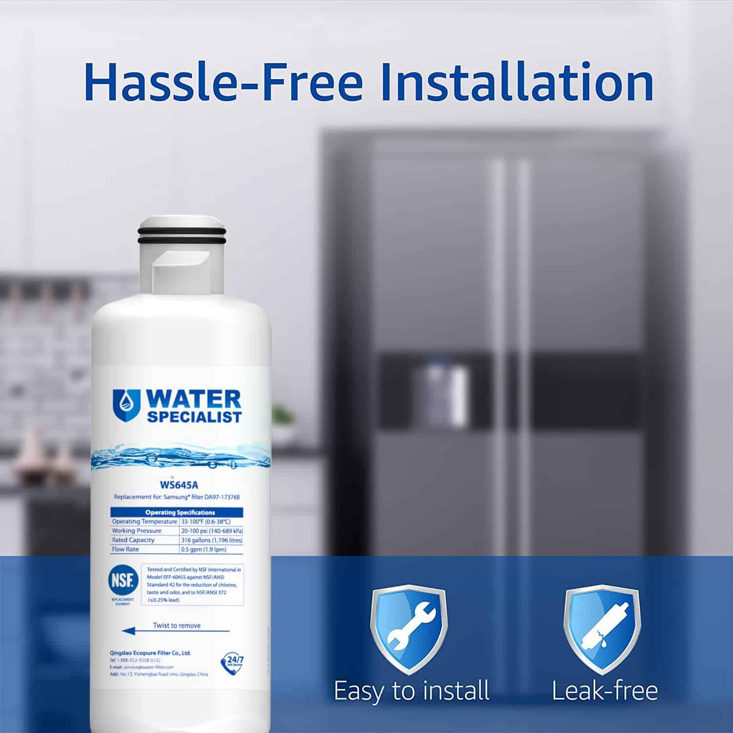 4. Ajuste perfecto: Waterspecialist combina tecnología de medición de precisión para producir filtros de refrigerador con diseños de ingeniería exquisitos, a diferencia de los filtros de reemplazo inferiores que pueden causar problemas de fugas de agua. Además, Waterspecialist le ahorra tiempo y problemas al ofrecer reemplazos de filtros de refrigerador sin herramientas.