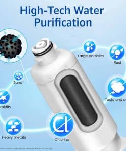 3. Material de filtro premium: Waterspecialist seleccionó una carcasa de filtro libre de BPA y grado alimenticio que pasó la certificación NSF 372 para una filtración libre de plomo. También adoptamos bloque de carbono de cáscara de coco natural que contiene una superficie más grande y más microporos. Por lo tanto, el cartucho del filtro puede reducir eficazmente el cloro, el mal sabor y el olor.