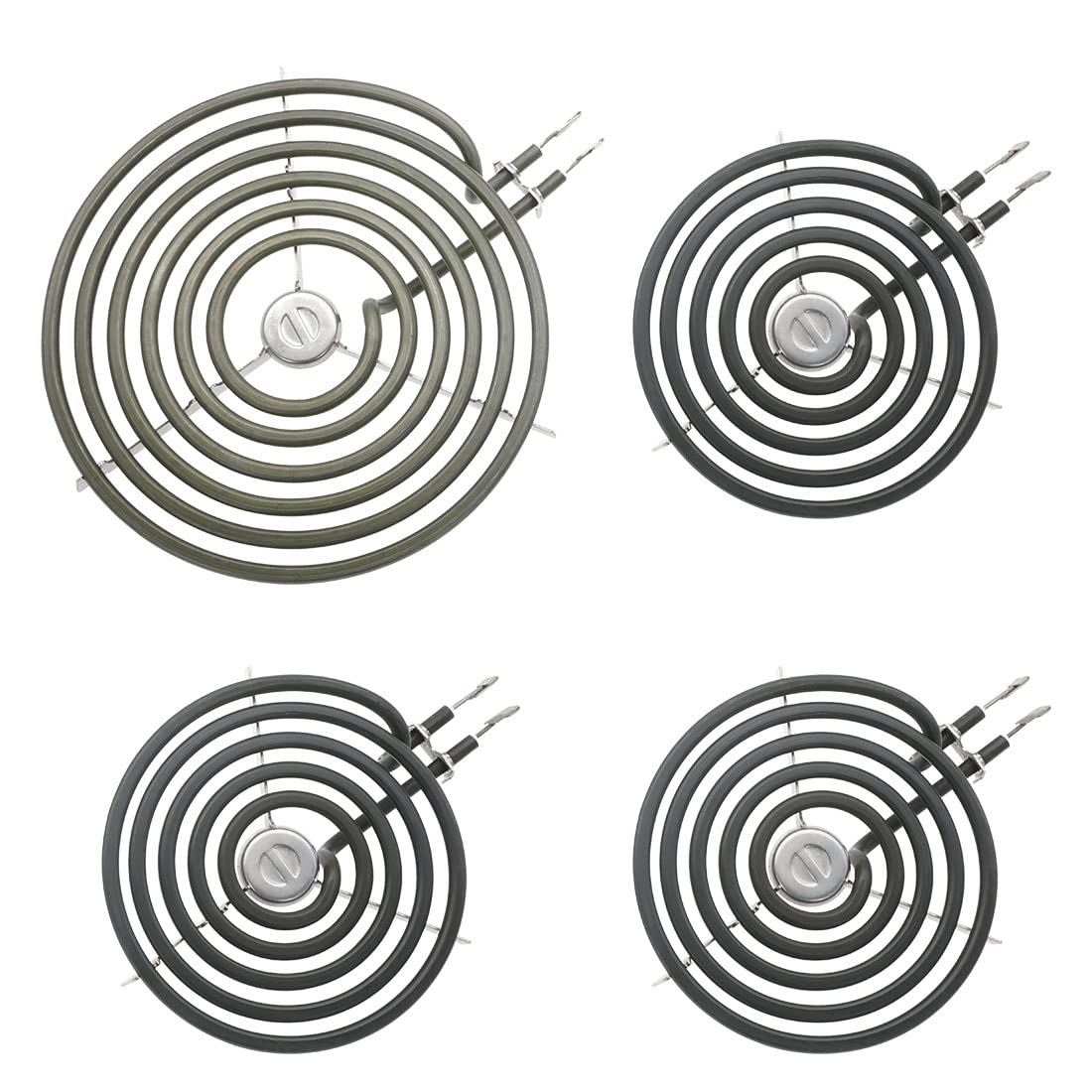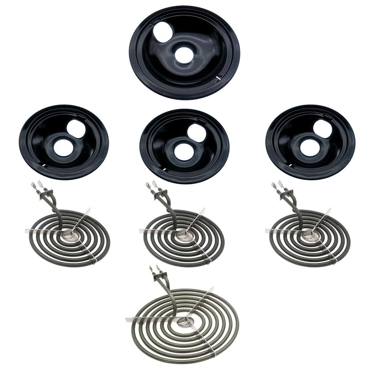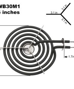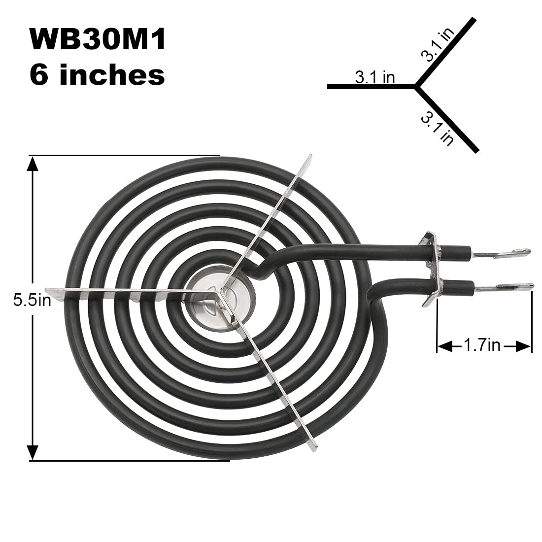 Número de parte: WB31M20, WB31M19 Color: Negro Tamaño: WB31M20 de 6 pulgadas mide 7.63 pulgadas; WB31M19 de 8 pulgadas mide 9.76 pulgadas. Reemplaza los números de parte: WB31M20 reemplaza WB31M0020, WB31M20-100PK, WB32X5070, PS244375, AP2028044, EAP244375. WB31M19 reemplaza WB31M0019, WB31M19-100PK, WB32X5069, AP2028043, PS244373, EAP244373. Número de parte: WB30M1, WB30M2 Características: La cantidad de vueltas indica cuántas veces la bobina va alrededor en un círculo. Tiene un soporte en forma de «Y». Si el quemador de la estufa no se asienta correctamente en su estufa, asegúrese de que los pernos de conexión estén paralelos y un poco hacia abajo. Después de instalado y encender la estufa por primera vez, la capa protectora del centro se quemará y se generará humo, lo cual es normal. No se preocupe por esto. El elemento calefactor funcionará correctamente. Lista del paquete: 3 x Bandejas de Goteo de Pequeñas WB31M20, 6 pulgadas 1 x Bandeja de Goteo de Grande WB31M19, 8 pulgadas 3 x Quemadores de 6 pulgadas WB30M1 (1350 vatios 208/240v 5 vueltas) 1 x Quemador de 8 pulgadas WB30M2 (1765 vatios 208/240v 6 vueltas) ¡Elige nuestras bandejas de goteo WB31M20 & WB31M19 y elemento de quemador de rango eléctrico WB30M1 WB30M2 para ahorrar tiempo y dinero ahora!