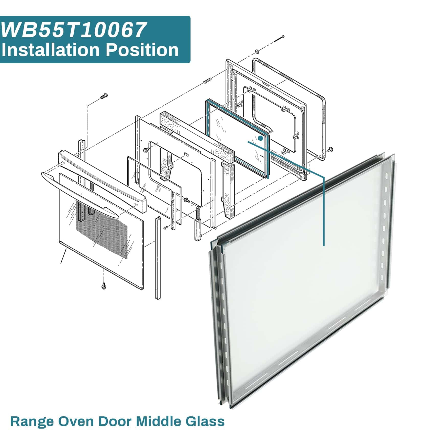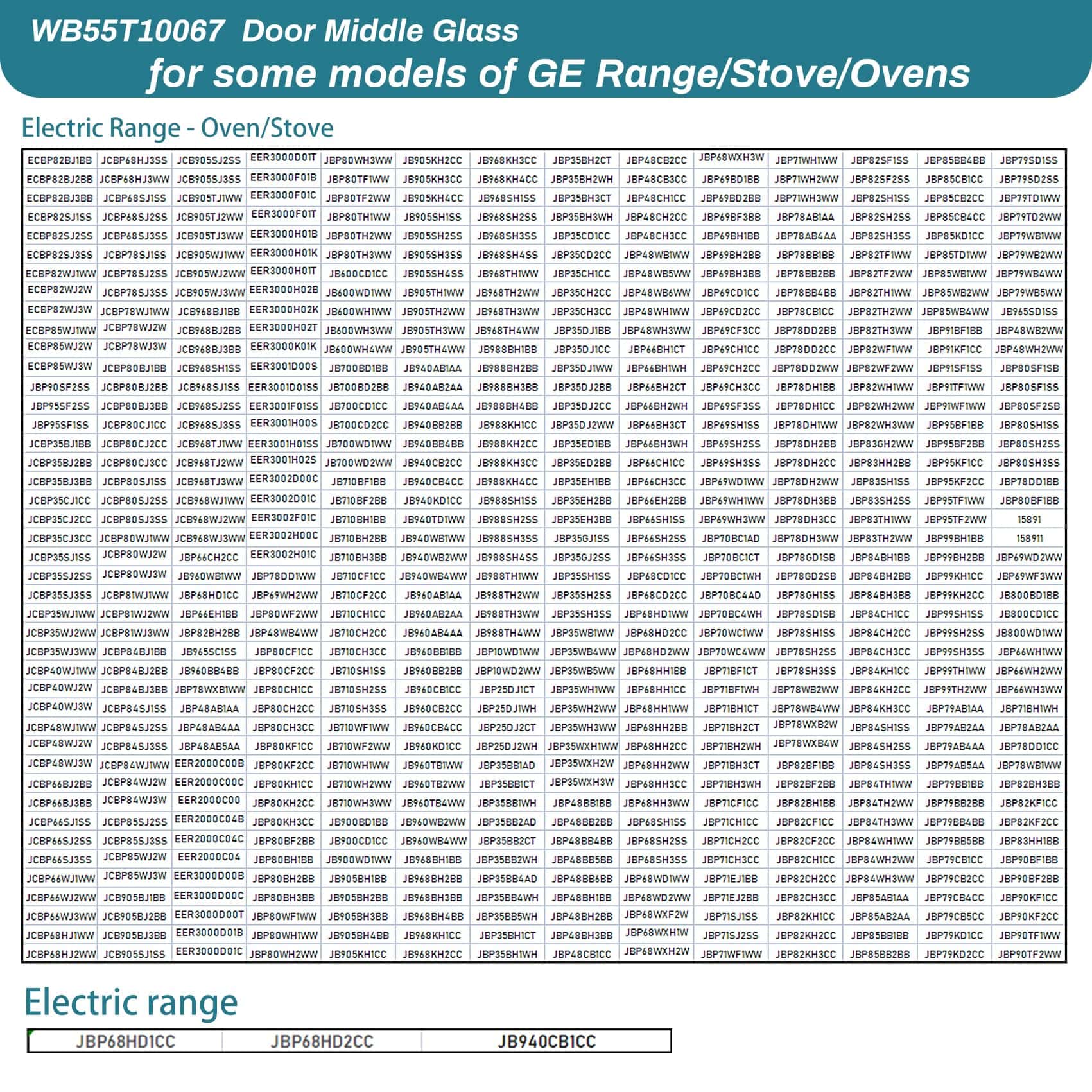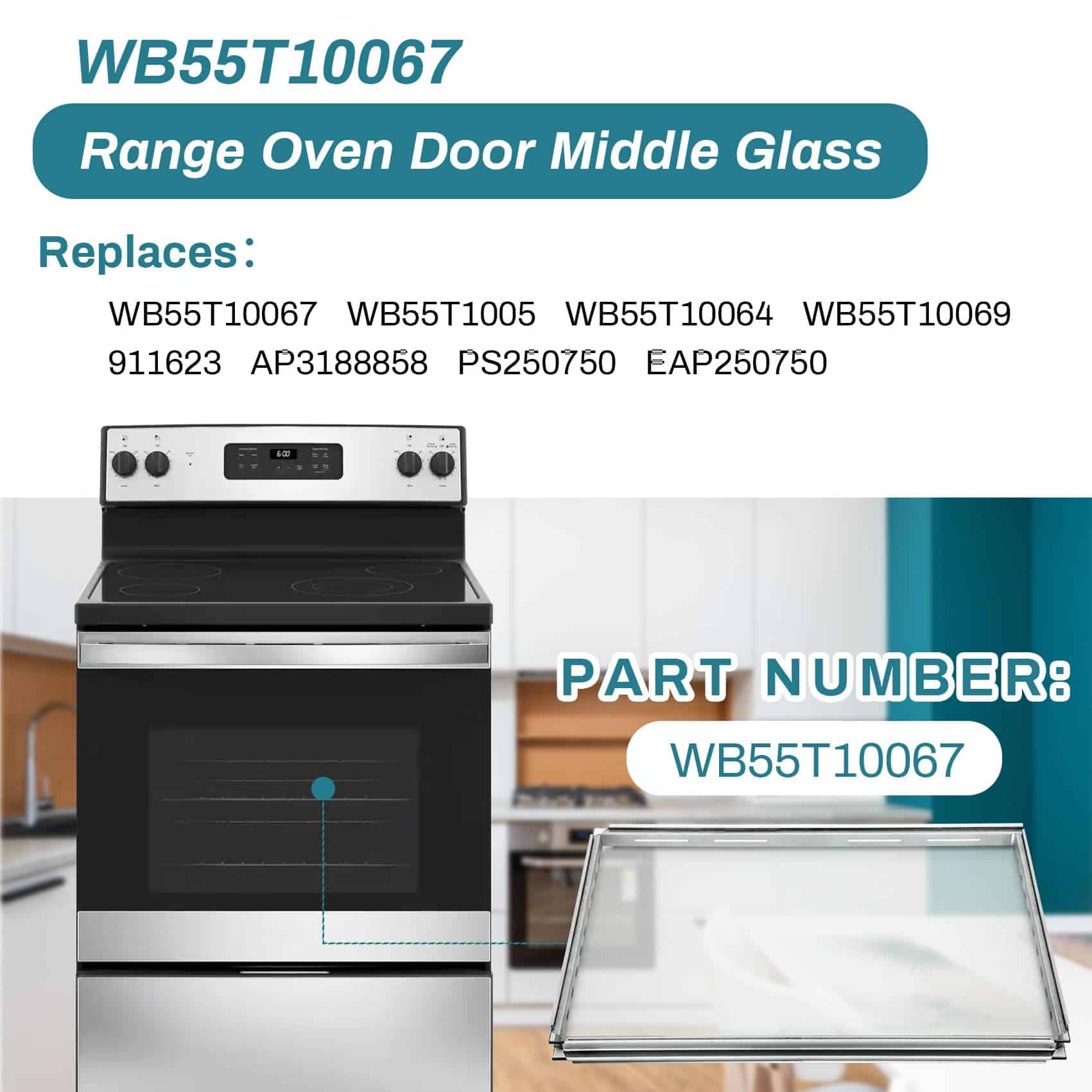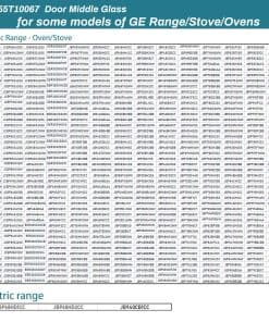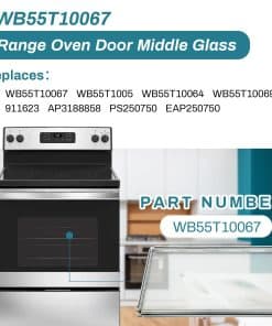 2. Número de Parte: WB55T10067 reemplazo de vidrio medio de puerta de hornos GE, estufas, cocinas es el vidrio resistente al calor en el medio de la ventana de la puerta del horno. Reemplaza a WB55T10055, WB55T10064, WB55T10069, WB55T10107.