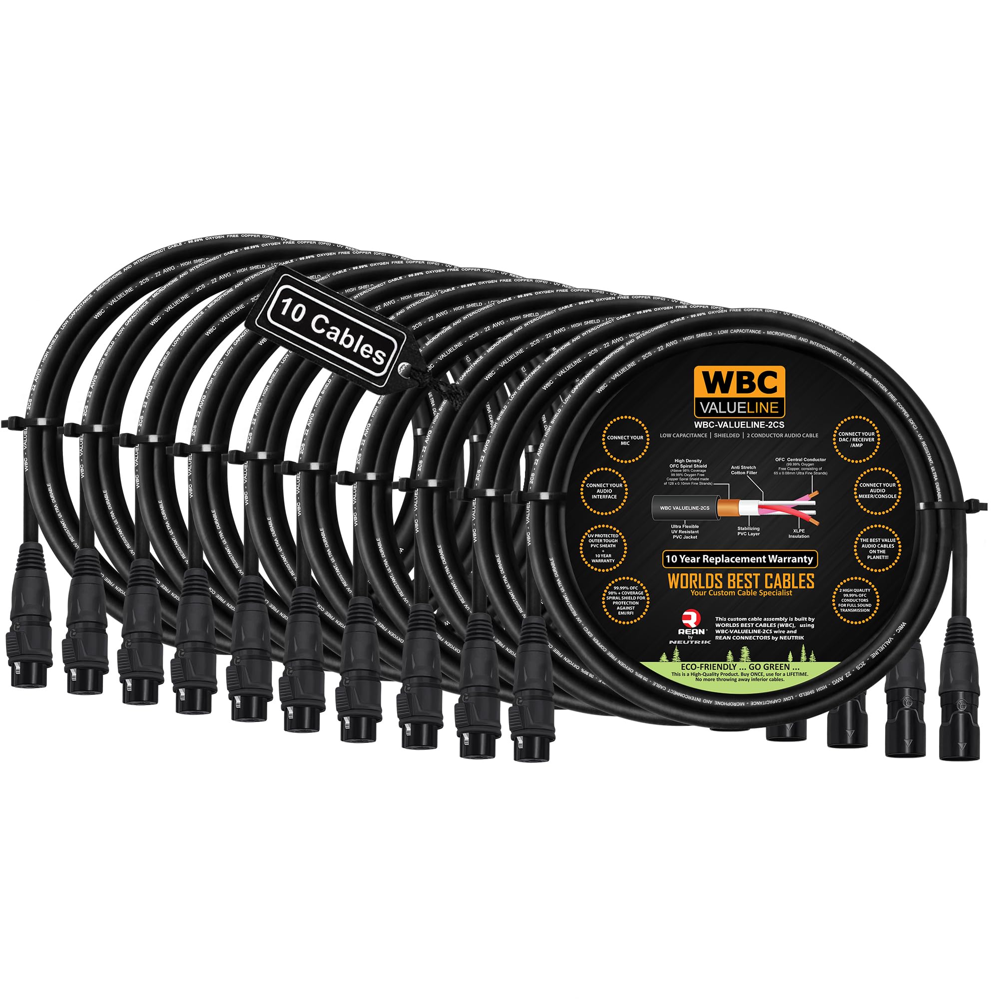 WBC-VALUELINE-2CS (22 AWG) es un cable de micrófono, altavoz activo e interconexión de baja capacitancia de 22AWG. Fruto de años de rigurosa I+D, el 2CS cuenta con una chaqueta protegida contra los rayos UV, un escudo espiral denso, un sub-escudo XLPE y dos núcleos de cobre libre de oxígeno al 99.99%, hechos de hebras ultrafinas de 0.08mm. El excelente blindaje elimina todo EMI y RFI, garantizando una transmisión de señal pura. El cable, listo para la carretera, cancela cualquier interferencia que pueda encontrar, resultando en una transmisión de señal pura. La chaqueta flexible y sin enredos hace que el cable sea extremadamente fácil de usar. WBC-VALUELINE se presenta para cubrir la necesidad de un cable de audio de calidad superior, grado profesional y asequible. Aunque está hecho para uso profesional rudo en escenarios y estudios, nuestros precios razonables significan que los usuarios domésticos y entusiastas también podrán disfrutar de estos cables de grado profesional sin arruinarse. Respaldamos todo nuestro equipo con una garantía de reposición de 10 años sin preguntas bajo cualquier escenario de uso riguroso, incluido el uso en la carretera. Los conectores utilizados en este ensamblaje de cable profesional: RCX3M-Z-002 y RCX3F-Z-002 son ofertas de XLR para uso en exteriores de grado profesional de Rean, una empresa de Neutrik AG. Estos enchufes XLR ergonómicos cuentan con contactos de bronce bañados en oro para un rendimiento superior y un diseño a prueba de polvo/agua con clasificación IP65 (en condición acoplada), fabricado con materiales clasificados UL94 V-0. El elegante cuerpo de zinc fundido a presión tiene un acabado duradero resistente a la abrasión en negro. Todos nuestros cables personalizados están soldados profesionalmente utilizando la mezcla de soldadura de plata al 4% de WBC y un proceso de soldadura asistido por nitrógeno único en nosotros, que supera los estándares de la industria, mejora la integridad de las uniones de soldadura sobre los métodos tradicionales. Nuestro largo período de garantía es un testimonio de la calidad y durabilidad de estos cables. Esta venta es por 10 cables individuales, cada cable tiene una longitud de 6 pies. En WORLDS BEST CABLES garantizamos que se trata de un producto de grado profesional, estamos enfocados en brindar el mayor valor a nuestros clientes. Nuestros precios son verdaderamente revolucionarios, por favor no juzgue nuestros productos por sus precios asequibles, pruébenos y se sorprenderá gratamente, no olvide comparar nuestro equipo con marcas tradicionales (superaremos y sobrepasaremos sus expectativas).