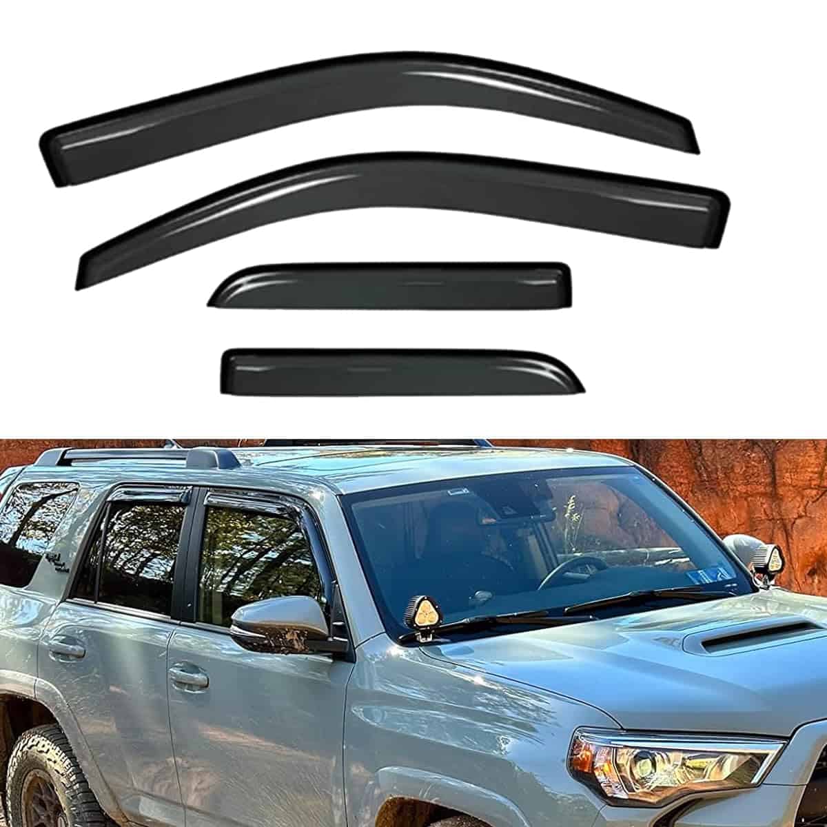 Deflectores de ventana laterales Wensdy con ajuste externo, diseñados específicamente para Toyota 4Runner 2010-2024. Estos deflectores están diseñados para proteger su vehículo de la lluvia, el sol y otros elementos, manteniendo su viaje cómodo y agradable. Fáciles de instalar, estos deflectores incluyen un protector contra la lluvia, visera solar y protector de ventana para brindarle la máxima protección. Mantenga su vehículo protegido con estos deflectores de ventanilla de alta calidad.