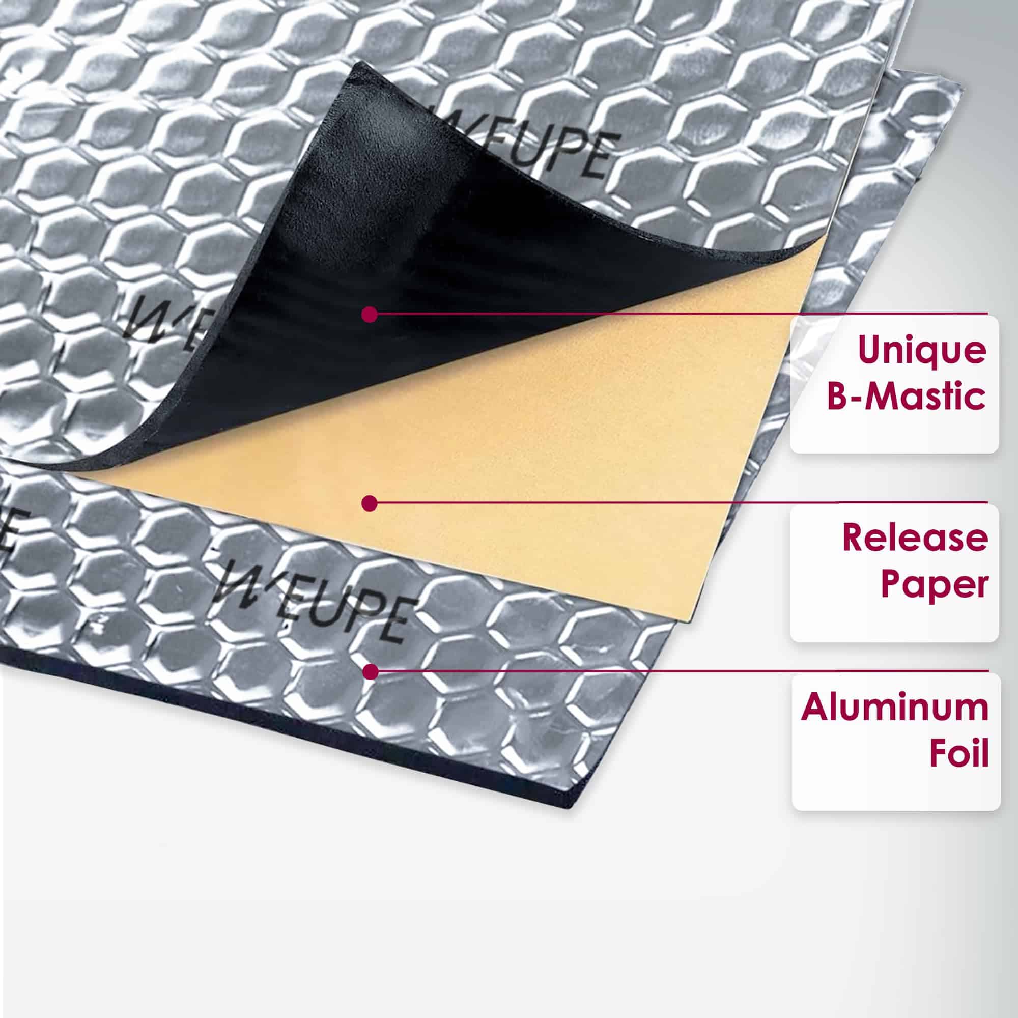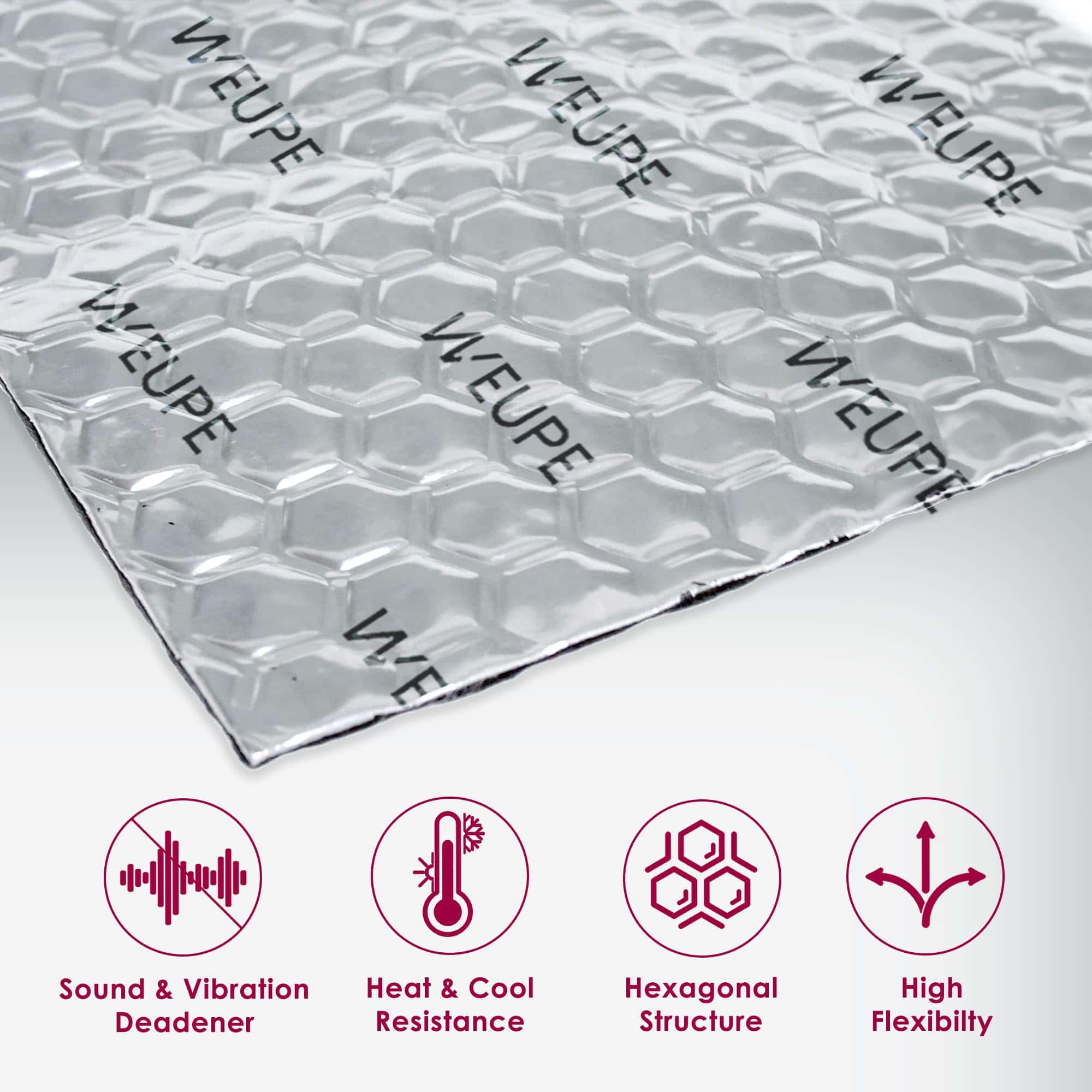 WEUPE Mat de Insonorización para Autos, 50 mil 18 sqft, Material para Insonorización de Automóviles de Butilo, Aislamiento de Ruido para Maletero, Altavoz, Puerta, Piso y Techo del Auto, Plateado