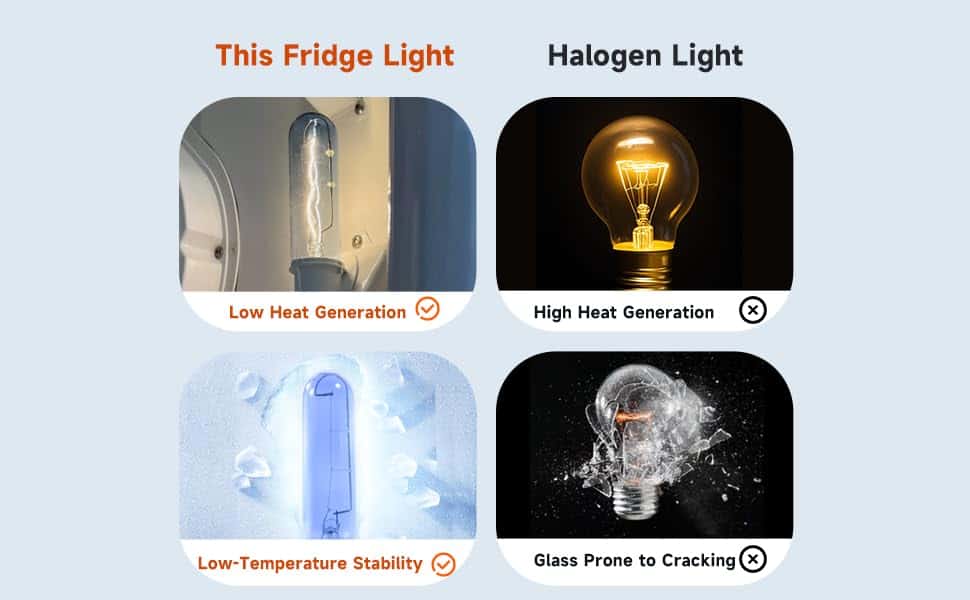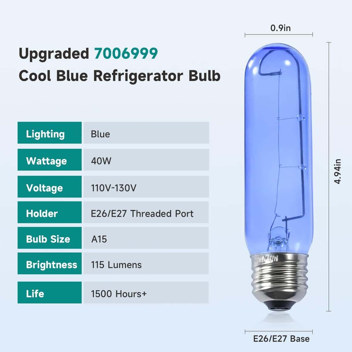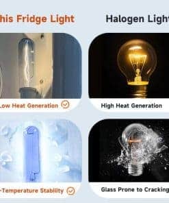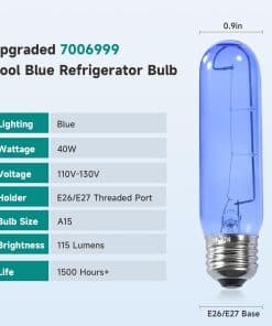 4. Ampliamente Utilizado : Perfecto para refrigeradores, congeladores, enfriadores de vino, etc. El diseño de vidrio azul proporciona una iluminación amarilla cálida natural y elegante para su refrigerador, resaltando los colores reales de sus alimentos sin distorsión. Importante: Verifique la compatibilidad de la base (E26/E27) con su accesorio para garantizar una instalación segura.