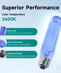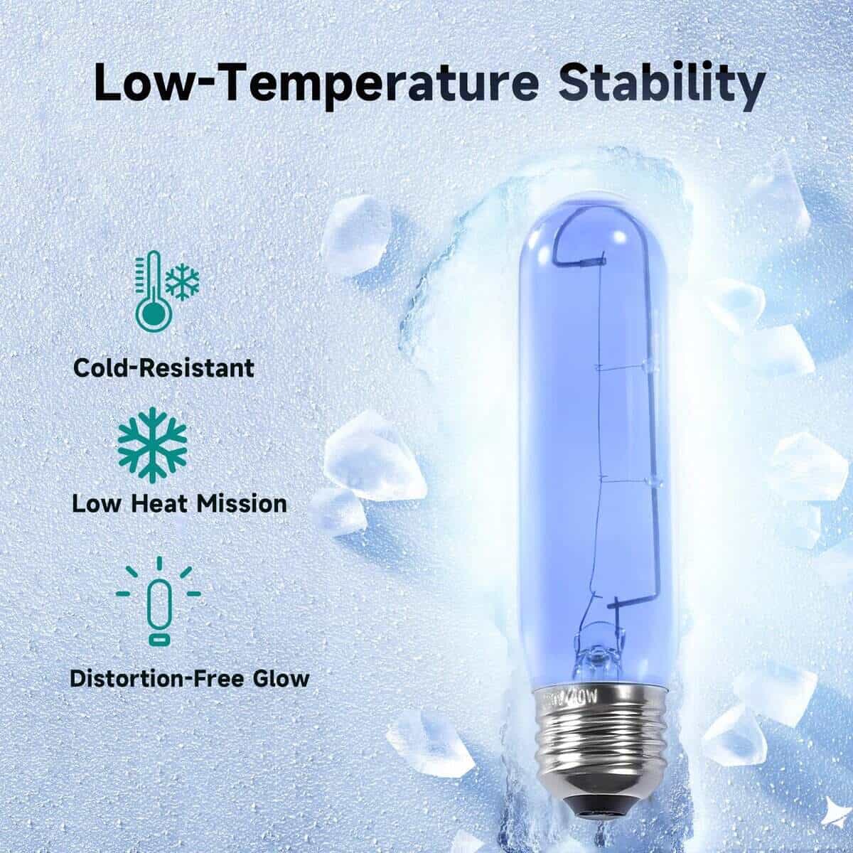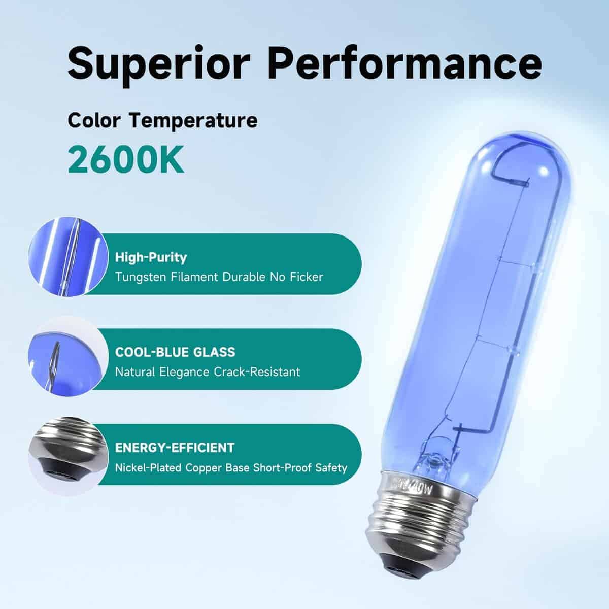 3. Material Confiable : Filamento de Tungsteno de Alta Pureza: Diseño duradero y libre de parpadeos con una vida útil de hasta 1,500 horas. Exterior de Vidrio Azul Premium: El vidrio azul puede adaptarse al ambiente de congelación de los refrigeradores, con resistencia a bajas temperaturas y propiedades a prueba de golpes. Proporciona iluminación omnidireccional de 360 , creando un ambiente de color natural y confortable. Garantiza suficiente brillo mientras protege sus ojos. Base de Cobre Niquelado: Ofrece una conductividad superior, resistencia al óxido y prevención de cortocircuitos, mejorando la seguridad y extendiendo la vida útil de la bombilla.