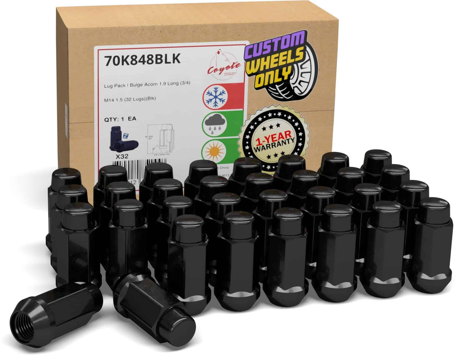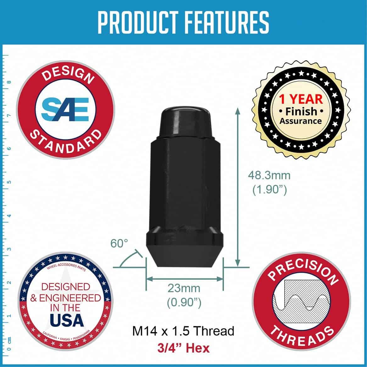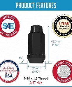 Estas tuercas especiales están diseñadas para ser utilizadas exclusivamente con rines de reposición. Es importante verificar la compatibilidad del producto con tu vehículo antes de la instalación. El set incluye 32 piezas de 1.90″ de largo con rosca M14x1.5 y asiento cónico de 60 grados, acabado en negro. Diseñado en EE.UU., estas tuercas de 3/4″ de alto hexagonal son ideales para aplicaciones en camiones ligeros donde los pernos originales son largos y requieren una tuerca más larga. El material de acero al carbono forjado en frío garantiza la resistencia y precisión del producto siguiendo los estándares SAE.