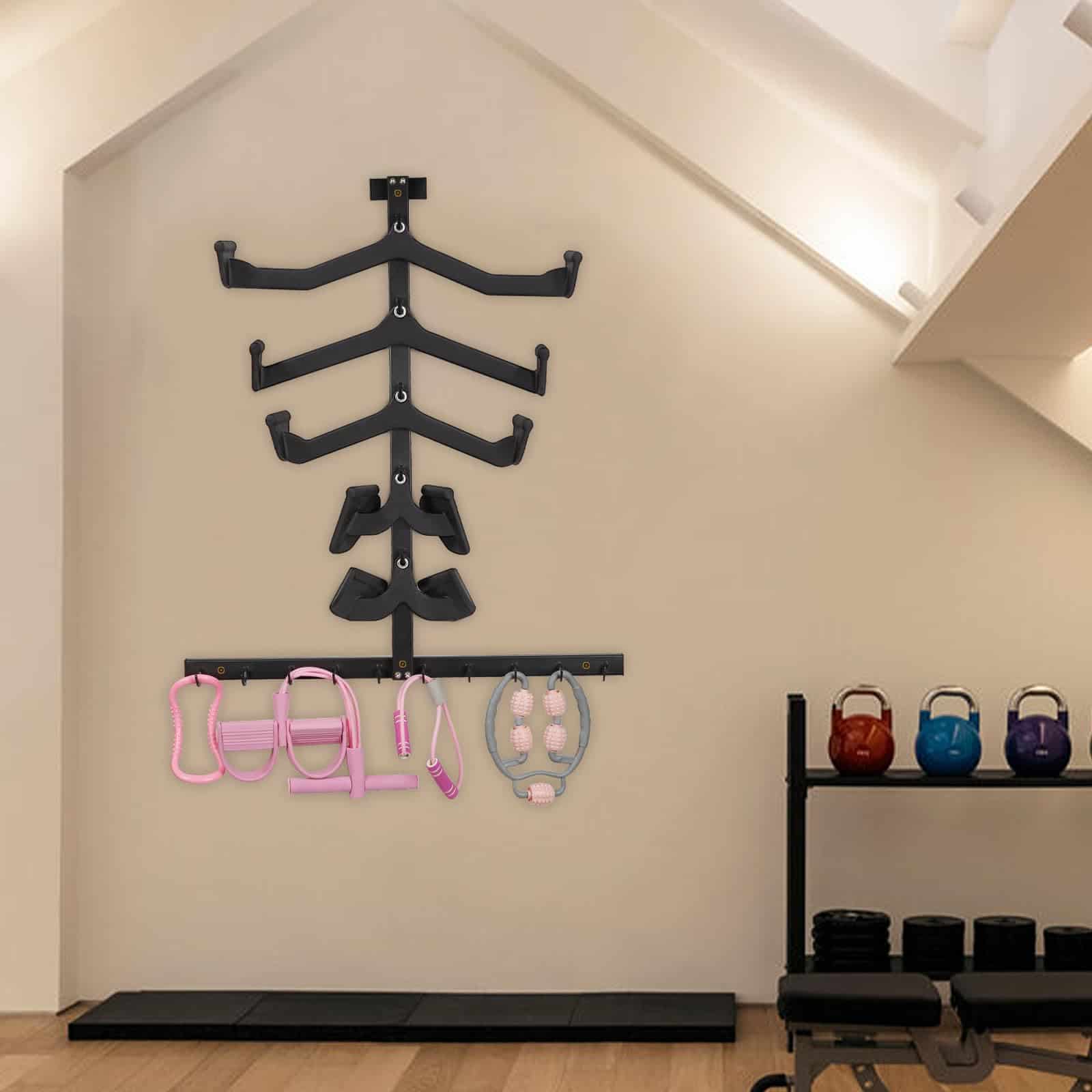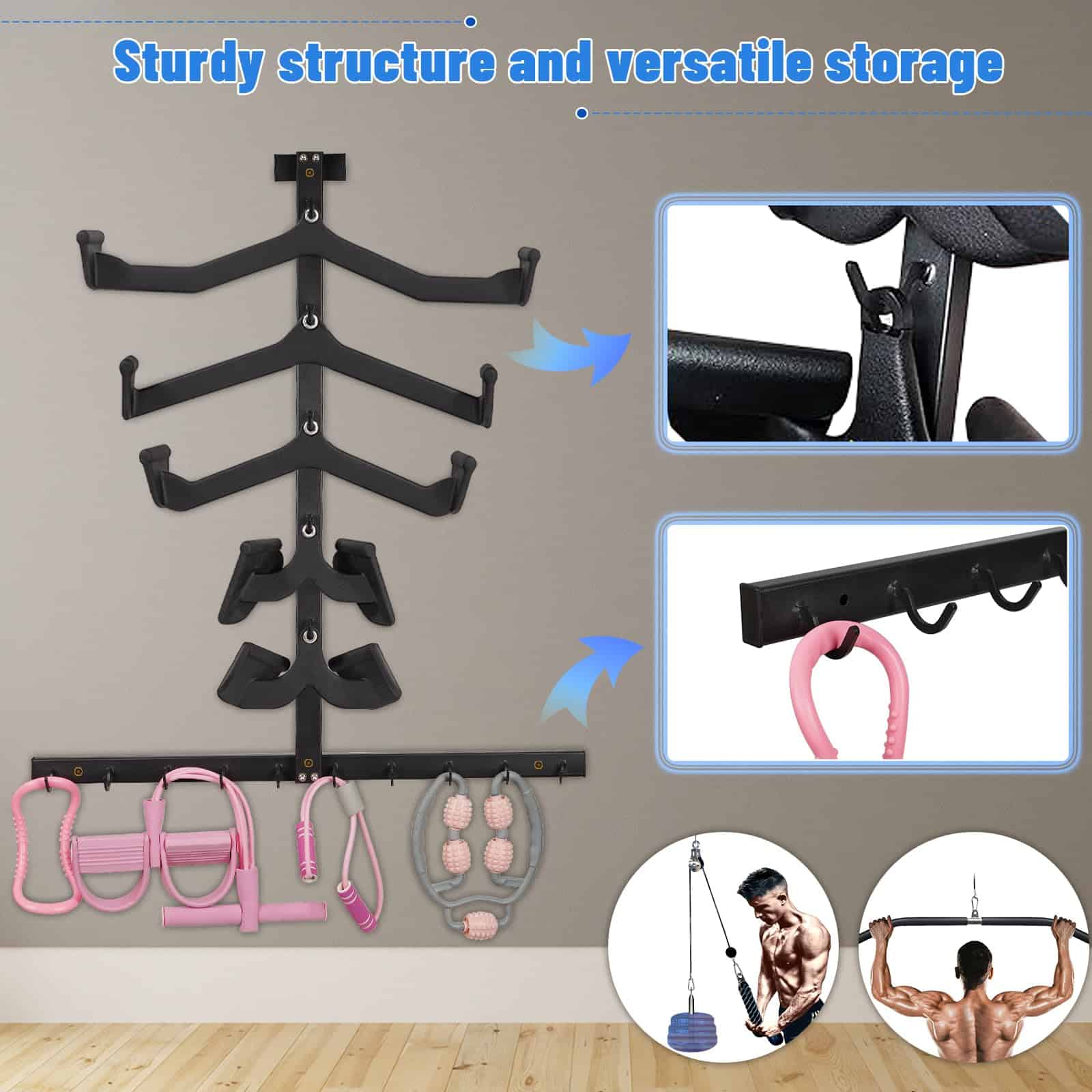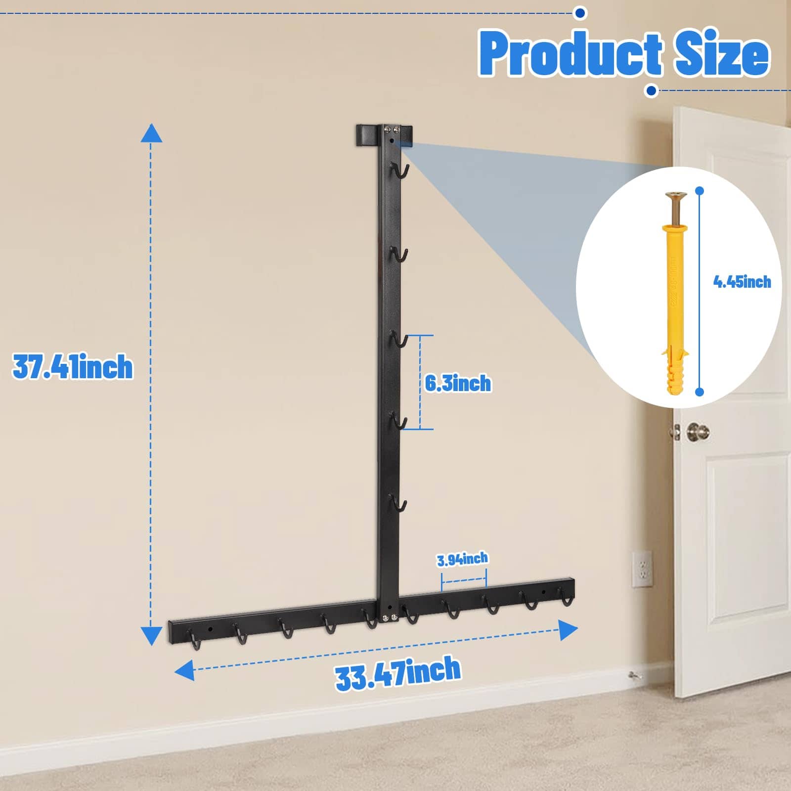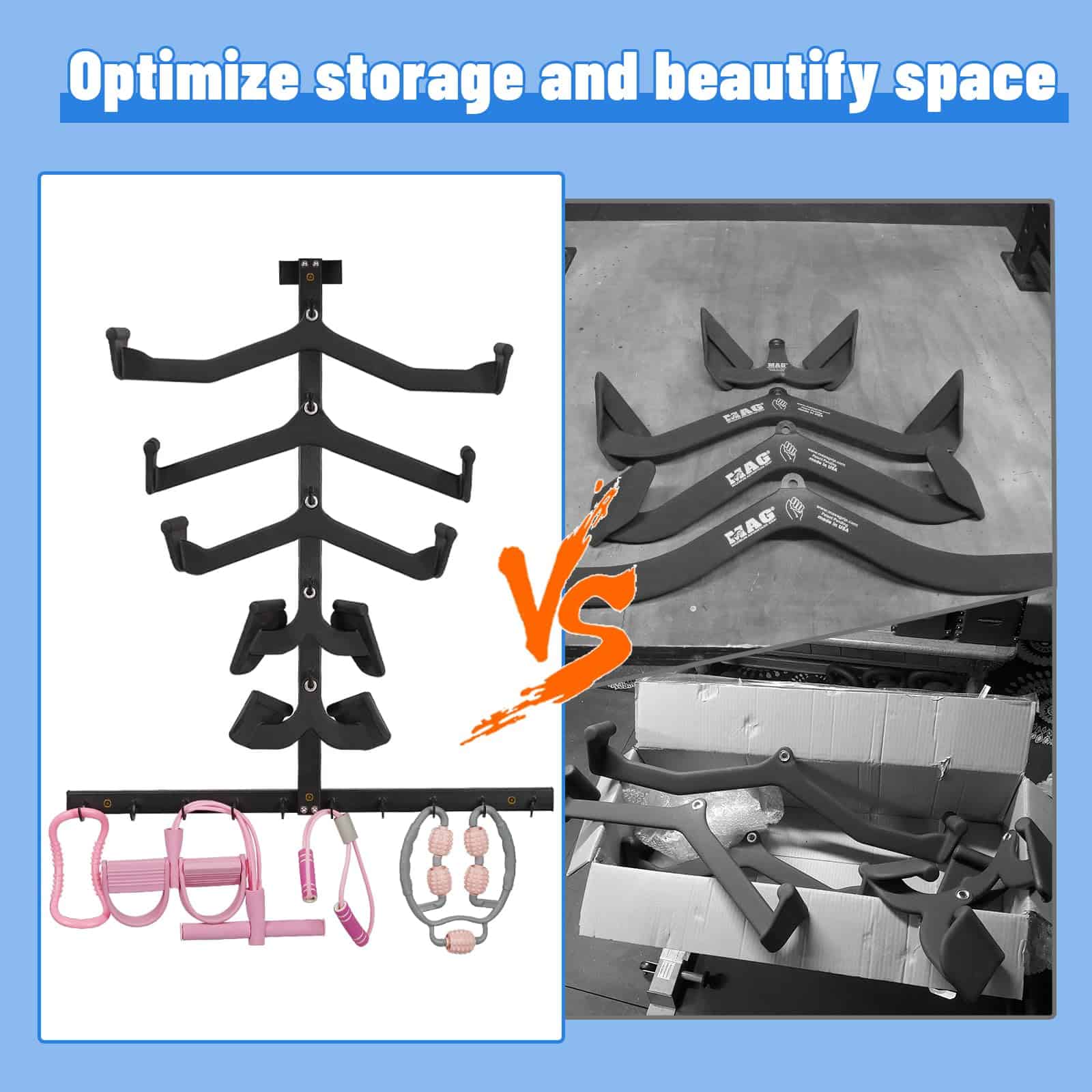 Multifunctional storage: Not only can it store the LAT Pull Down Bar, but it can also be used to store resistance bands, yoga rings, tensioners, and skipping ropes. Large-capacity organization: The upper layer is 37.4″ long and can hold 5 pull-down rods; the lower layer is 33.5″ long and has 8 hooks. Save space: Properly place the LAT Pull Down Bar to facilitate access while keeping the gym clean and tidy. Solid structure: The hook is firmly welded to the frame, simplifying the installation steps, making it stronger to use and more secure in bearing load. Convenient installation: Comes with installation instructions and installation tool kit, and can be easily assembled in just a few steps.