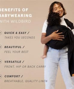Nuestro portabebés tipo Sling de Anillas WildBird está tejido con lujosas fibras de lino belga, 100% natural. Ligero y aireado, el lino es la solución óptima para la transpirabilidad. Nuestra tela es más fuerte, más sostenible y más duradera que el algodón. Se pliega compactamente y puede ser utilizado como sombrilla, cobertor de lactancia, manta y más. Diseñado para todas las madres, padres y cuidadores, nuestro Sling de Anillas fácil de almacenar ofrece un equilibrio entre belleza y practicidad. Este Sling ha sido reconocido como saludable para la cadera por el Instituto Internacional de Displasia de Cadera. Nuestro producto seguramente apoyará la posición natural de su bebé en todas las etapas. Los Portabebés tipo Sling de Anillas de WildBird son completamente ajustables e están destinados a ser accesibles para todos. El estándar (74€) se ajusta a la mayoría de los usuarios y el Largo (90€) está destinado para usuarios de talla grande o altos (más de 6 pies). Seguro para bebés desde recién nacidos hasta 35 libras.