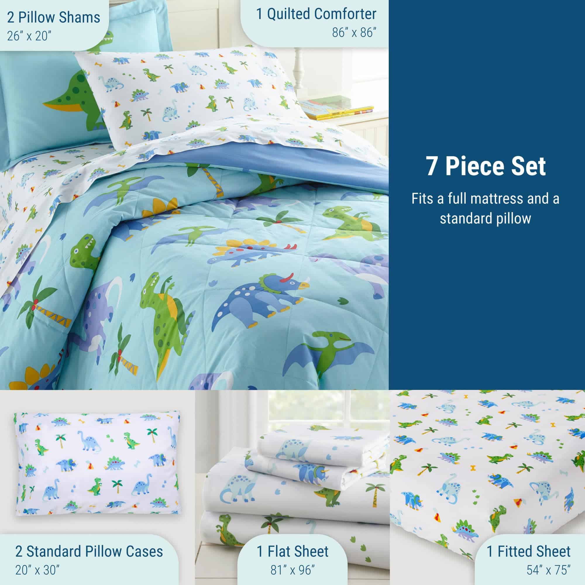 Drifting off to slumber land is a breeze when your child is snuggled up in Wildkin�s ultra-cozy 100% Cotton Full Bedding Set! Each full bedding set comes complete with a printed comforter, flat sheet, fitted bottom sheet, two coordinating pillowcases, and two embroidered shams. The comforter, flat sheet, and fitted sheet all fit a standard full mattress. The matching pillowcases and embroidered shams all fit a standard pillow. Wildkin�s 7 Piece Full Comforter features a 100% cotton exterior that�s perfect for cozy cuddles. Its lightweight material makes the comforter breathable enough for hot summer nights, while keeping your little one nice and warm once those colder months roll around. Featuring vibrant, playful Olive Kids designs on each of the seven included pieces, your little one will love this fun addition to their room. While the exterior of the comforter is bursting with character, the cotton interior is solid, creating a sweet contrast. The coordinating flat sheet, fitted sheet, pillowcases, and embroidered shams tie the theme together for a bold, whimsical look that your little one will love. Our 100% Cotton Full Bedding Sets are certified OEKO-TEX Standard 100 and free of harmful chemicals, so you can trust that your child�s bedding is both extremely safe and comfy. All components of textiles carrying the OEKO-TEX Standard 100 label have been tested for harmful substances and deemed harmless in human ecological terms. Each full bedding set was designed to coordinate with other Wildkin room d�cor. From plush pillows, to toy chests, to storage cubes, your little one will love seeing their favorite designs pop up throughout their room. Machine wash pieces separately on a cold, gentle cycle. Use only non-chlorine bleach when needed. Tumble dry on low heat. Warm iron as needed. Please wash prior to use. 90-day manufacturer’s warranty against defects – normal wear-and-tear, and misuse excluded. Rigorously tested to ensure that all parts are lead-safe, bpa-free, phthalate-free, and conform to all rules and regulations set forth by the Consumer Products Safety Commission.