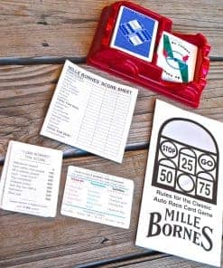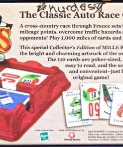 Primer publicación en 1962, Mille Bornes (pronunciado «meel born,» en francés significa «hitos») es un juego de cartas de carreras de automóviles cuyo objetivo, para cada equipo de dos jugadores, es ser el primero en completar una serie de viajes de 1,000 millas. Cada jugador tiene una mano de seis cartas y recoge más a su vez de un montón central. Hay cartas de Distancia, Peligro, Remedio y Seguridad, cada una con varias subcategorías, que determinan el curso del juego. Esta Edición Coleccionista reproduce las ilustraciones del juego original. El set incluye una bandeja de cartas de plástico en forma de automóvil, hojas de puntuación, instrucciones y una baraja de 110 cartas con idioma en inglés y francés. ¡Buen viaje! – Richard Farr. De fabricante. Corre por Francia ganando puntos de millaje, superando peligros de tráfico y saboteando a tus oponentes. La Edición del Coleccionista presenta las encantadoras ilustraciones de las cartas originales de 1962 y una bandeja en forma de cartas diseñada a medida.