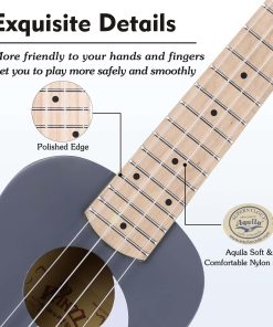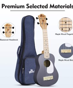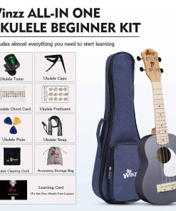 1. Materiales Premium: El ukelele Winzz está hecho con materiales de alta calidad que brindan un tono claro y nítido. 2. Cuerdas Aquila: Las cuerdas importadas Aquila son fáciles de presionar y mantenerse en sintonía por mucho tiempo. 3. Bolsa Azul Marino: Incluye una bolsa azul marino que protege tu ukelele y accesorios. 4. Accesorios Completos: Viene con una tarjeta de aprendizaje de un mes, capo negro, correa a cuadros blanco y negro, calcomanías para el diapasón, paño de limpieza, afinador y bolsa de accesorios. 5. Adecuado para Todas las Edades: Fácil de aprender para amantes de la música de todas las edades.